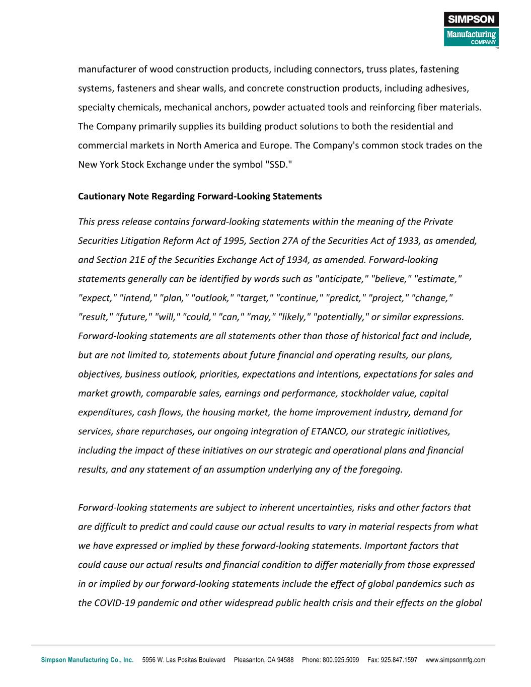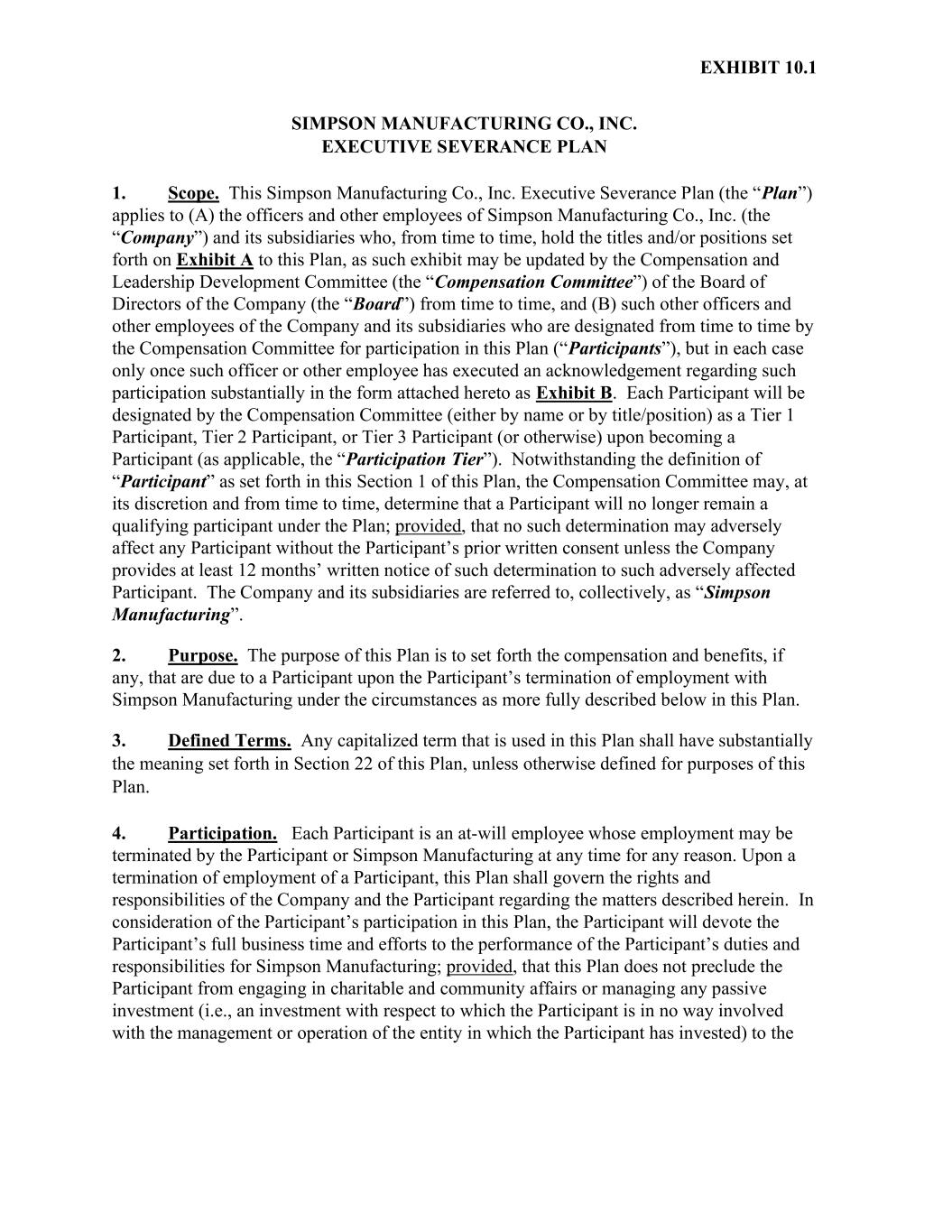 EXHIBIT 10.1 SIMPSON MANUFACTURING CO., INC. EXECUTIVE SEVERANCE PLAN 1. Scope. This Simpson Manufacturing Co., Inc. Executive Severance Plan (the “Plan”) applies to (A) the officers and other employees of Simpson Manufacturing Co., Inc. (the “Company”) and its subsidiaries who, from time to time, hold the titles and/or positions set forth on Exhibit A to this Plan, as such exhibit may be updated by the Compensation and Leadership Development Committee (the “Compensation Committee”) of the Board of Directors of the Company (the “Board”) from time to time, and (B) such other officers and other employees of the Company and its subsidiaries who are designated from time to time by the Compensation Committee for participation in this Plan (“Participants”), but in each case only once such officer or other employee has executed an acknowledgement regarding such participation substantially in the form attached hereto as Exhibit B. Each Participant will be designated by the Compensation Committee (either by name or by title/position) as a Tier 1 Participant, Tier 2 Participant, or Tier 3 Participant (or otherwise) upon becoming a Participant (as applicable, the “Participation Tier”). Notwithstanding the definition of “Participant” as set forth in this Section 1 of this Plan, the Compensation Committee may, at its discretion and from time to time, determine that a Participant will no longer remain a qualifying participant under the Plan; provided, that no such determination may adversely affect any Participant without the Participant’s prior written consent unless the Company provides at least 12 months’ written notice of such determination to such adversely affected Participant. The Company and its subsidiaries are referred to, collectively, as “Simpson Manufacturing”. 2. Purpose. The purpose of this Plan is to set forth the compensation and benefits, if any, that are due to a Participant upon the Participant’s termination of employment with Simpson Manufacturing under the circumstances as more fully described below in this Plan. 3. Defined Terms. Any capitalized term that is used in this Plan shall have substantially the meaning set forth in Section 22 of this Plan, unless otherwise defined for purposes of this Plan. 4. Participation. Each Participant is an at-will employee whose employment may be terminated by the Participant or Simpson Manufacturing at any time for any reason. Upon a termination of employment of a Participant, this Plan shall govern the rights and responsibilities of the Company and the Participant regarding the matters described herein. In consideration of the Participant’s participation in this Plan, the Participant will devote the Participant’s full business time and efforts to the performance of the Participant’s duties and responsibilities for Simpson Manufacturing; provided, that this Plan does not preclude the Participant from engaging in charitable and community affairs or managing any passive investment (i.e., an investment with respect to which the Participant is in no way involved with the management or operation of the entity in which the Participant has invested) to the