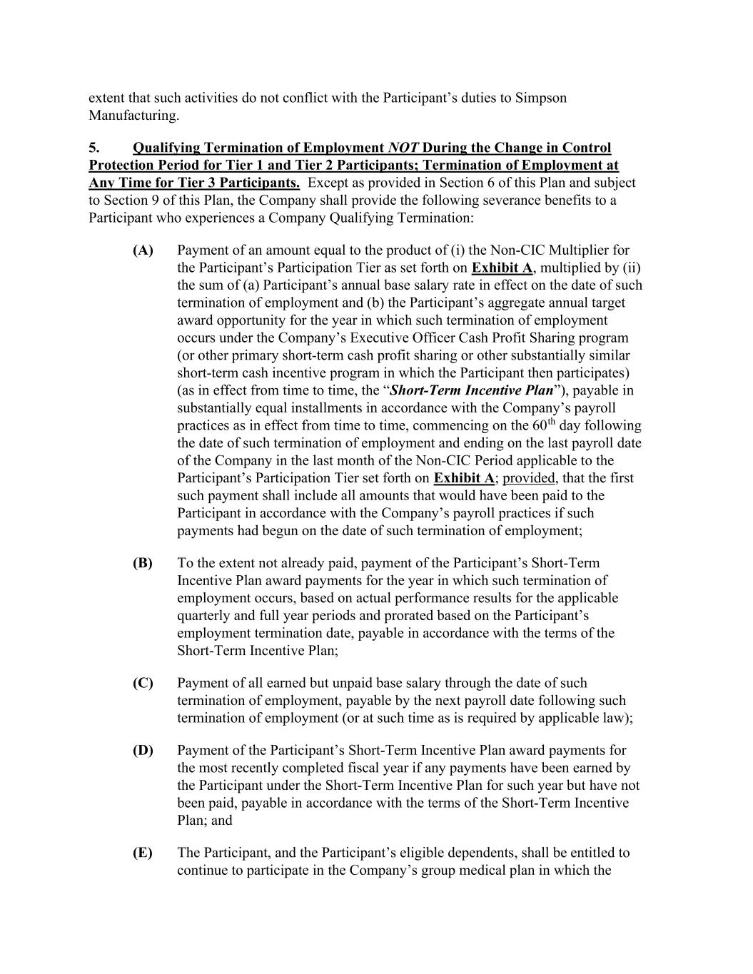 extent that such activities do not conflict with the Participant’s duties to Simpson Manufacturing. 5. Qualifying Termination of Employment NOT During the Change in Control Protection Period for Tier 1 and Tier 2 Participants; Termination of Employment at Any Time for Tier 3 Participants. Except as provided in Section 6 of this Plan and subject to Section 9 of this Plan, the Company shall provide the following severance benefits to a Participant who experiences a Company Qualifying Termination: (A) Payment of an amount equal to the product of (i) the Non-CIC Multiplier for the Participant’s Participation Tier as set forth on Exhibit A, multiplied by (ii) the sum of (a) Participant’s annual base salary rate in effect on the date of such termination of employment and (b) the Participant’s aggregate annual target award opportunity for the year in which such termination of employment occurs under the Company’s Executive Officer Cash Profit Sharing program (or other primary short-term cash profit sharing or other substantially similar short-term cash incentive program in which the Participant then participates) (as in effect from time to time, the “Short-Term Incentive Plan”), payable in substantially equal installments in accordance with the Company’s payroll practices as in effect from time to time, commencing on the 60th day following the date of such termination of employment and ending on the last payroll date of the Company in the last month of the Non-CIC Period applicable to the Participant’s Participation Tier set forth on Exhibit A; provided, that the first such payment shall include all amounts that would have been paid to the Participant in accordance with the Company’s payroll practices if such payments had begun on the date of such termination of employment; (B) To the extent not already paid, payment of the Participant’s Short-Term Incentive Plan award payments for the year in which such termination of employment occurs, based on actual performance results for the applicable quarterly and full year periods and prorated based on the Participant’s employment termination date, payable in accordance with the terms of the Short-Term Incentive Plan; (C) Payment of all earned but unpaid base salary through the date of such termination of employment, payable by the next payroll date following such termination of employment (or at such time as is required by applicable law); (D) Payment of the Participant’s Short-Term Incentive Plan award payments for the most recently completed fiscal year if any payments have been earned by the Participant under the Short-Term Incentive Plan for such year but have not been paid, payable in accordance with the terms of the Short-Term Incentive Plan; and (E) The Participant, and the Participant’s eligible dependents, shall be entitled to continue to participate in the Company’s group medical plan in which the