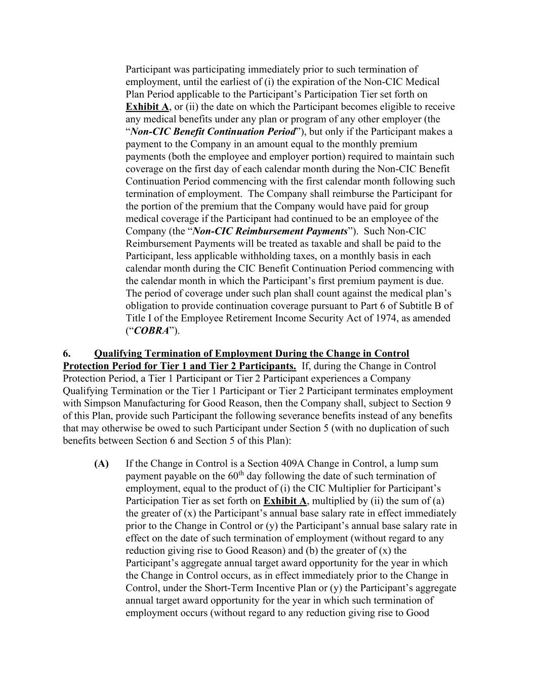 Participant was participating immediately prior to such termination of employment, until the earliest of (i) the expiration of the Non-CIC Medical Plan Period applicable to the Participant’s Participation Tier set forth on Exhibit A, or (ii) the date on which the Participant becomes eligible to receive any medical benefits under any plan or program of any other employer (the “Non-CIC Benefit Continuation Period”), but only if the Participant makes a payment to the Company in an amount equal to the monthly premium payments (both the employee and employer portion) required to maintain such coverage on the first day of each calendar month during the Non-CIC Benefit Continuation Period commencing with the first calendar month following such termination of employment. The Company shall reimburse the Participant for the portion of the premium that the Company would have paid for group medical coverage if the Participant had continued to be an employee of the Company (the “Non-CIC Reimbursement Payments”). Such Non-CIC Reimbursement Payments will be treated as taxable and shall be paid to the Participant, less applicable withholding taxes, on a monthly basis in each calendar month during the CIC Benefit Continuation Period commencing with the calendar month in which the Participant’s first premium payment is due. The period of coverage under such plan shall count against the medical plan’s obligation to provide continuation coverage pursuant to Part 6 of Subtitle B of Title I of the Employee Retirement Income Security Act of 1974, as amended (“COBRA”). 6. Qualifying Termination of Employment During the Change in Control Protection Period for Tier 1 and Tier 2 Participants. If, during the Change in Control Protection Period, a Tier 1 Participant or Tier 2 Participant experiences a Company Qualifying Termination or the Tier 1 Participant or Tier 2 Participant terminates employment with Simpson Manufacturing for Good Reason, then the Company shall, subject to Section 9 of this Plan, provide such Participant the following severance benefits instead of any benefits that may otherwise be owed to such Participant under Section 5 (with no duplication of such benefits between Section 6 and Section 5 of this Plan): (A) If the Change in Control is a Section 409A Change in Control, a lump sum payment payable on the 60th day following the date of such termination of employment, equal to the product of (i) the CIC Multiplier for Participant’s Participation Tier as set forth on Exhibit A, multiplied by (ii) the sum of (a) the greater of (x) the Participant’s annual base salary rate in effect immediately prior to the Change in Control or (y) the Participant’s annual base salary rate in effect on the date of such termination of employment (without regard to any reduction giving rise to Good Reason) and (b) the greater of (x) the Participant’s aggregate annual target award opportunity for the year in which the Change in Control occurs, as in effect immediately prior to the Change in Control, under the Short-Term Incentive Plan or (y) the Participant’s aggregate annual target award opportunity for the year in which such termination of employment occurs (without regard to any reduction giving rise to Good