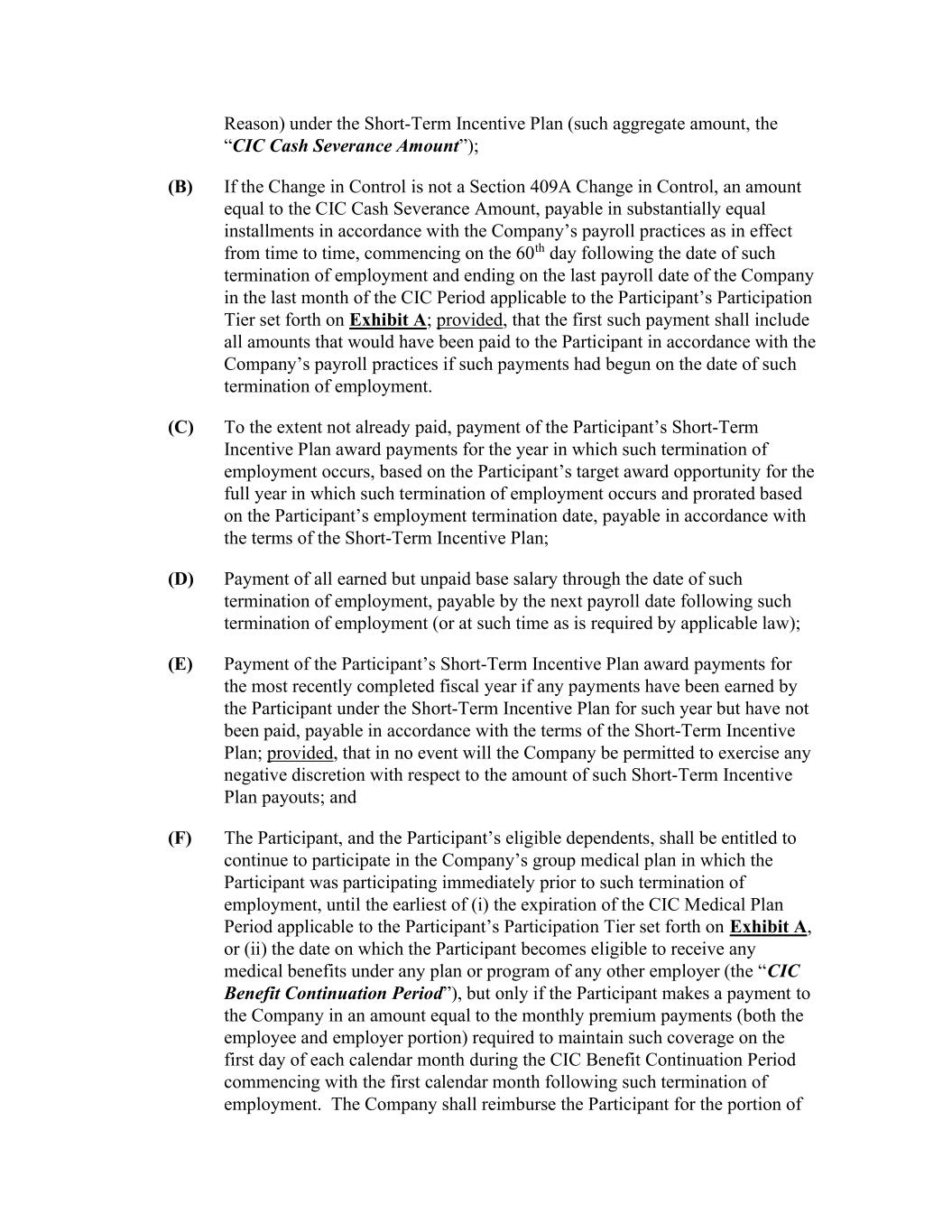 Reason) under the Short-Term Incentive Plan (such aggregate amount, the “CIC Cash Severance Amount”); (B) If the Change in Control is not a Section 409A Change in Control, an amount equal to the CIC Cash Severance Amount, payable in substantially equal installments in accordance with the Company’s payroll practices as in effect from time to time, commencing on the 60th day following the date of such termination of employment and ending on the last payroll date of the Company in the last month of the CIC Period applicable to the Participant’s Participation Tier set forth on Exhibit A; provided, that the first such payment shall include all amounts that would have been paid to the Participant in accordance with the Company’s payroll practices if such payments had begun on the date of such termination of employment. (C) To the extent not already paid, payment of the Participant’s Short-Term Incentive Plan award payments for the year in which such termination of employment occurs, based on the Participant’s target award opportunity for the full year in which such termination of employment occurs and prorated based on the Participant’s employment termination date, payable in accordance with the terms of the Short-Term Incentive Plan; (D) Payment of all earned but unpaid base salary through the date of such termination of employment, payable by the next payroll date following such termination of employment (or at such time as is required by applicable law); (E) Payment of the Participant’s Short-Term Incentive Plan award payments for the most recently completed fiscal year if any payments have been earned by the Participant under the Short-Term Incentive Plan for such year but have not been paid, payable in accordance with the terms of the Short-Term Incentive Plan; provided, that in no event will the Company be permitted to exercise any negative discretion with respect to the amount of such Short-Term Incentive Plan payouts; and (F) The Participant, and the Participant’s eligible dependents, shall be entitled to continue to participate in the Company’s group medical plan in which the Participant was participating immediately prior to such termination of employment, until the earliest of (i) the expiration of the CIC Medical Plan Period applicable to the Participant’s Participation Tier set forth on Exhibit A, or (ii) the date on which the Participant becomes eligible to receive any medical benefits under any plan or program of any other employer (the “CIC Benefit Continuation Period”), but only if the Participant makes a payment to the Company in an amount equal to the monthly premium payments (both the employee and employer portion) required to maintain such coverage on the first day of each calendar month during the CIC Benefit Continuation Period commencing with the first calendar month following such termination of employment. The Company shall reimburse the Participant for the portion of