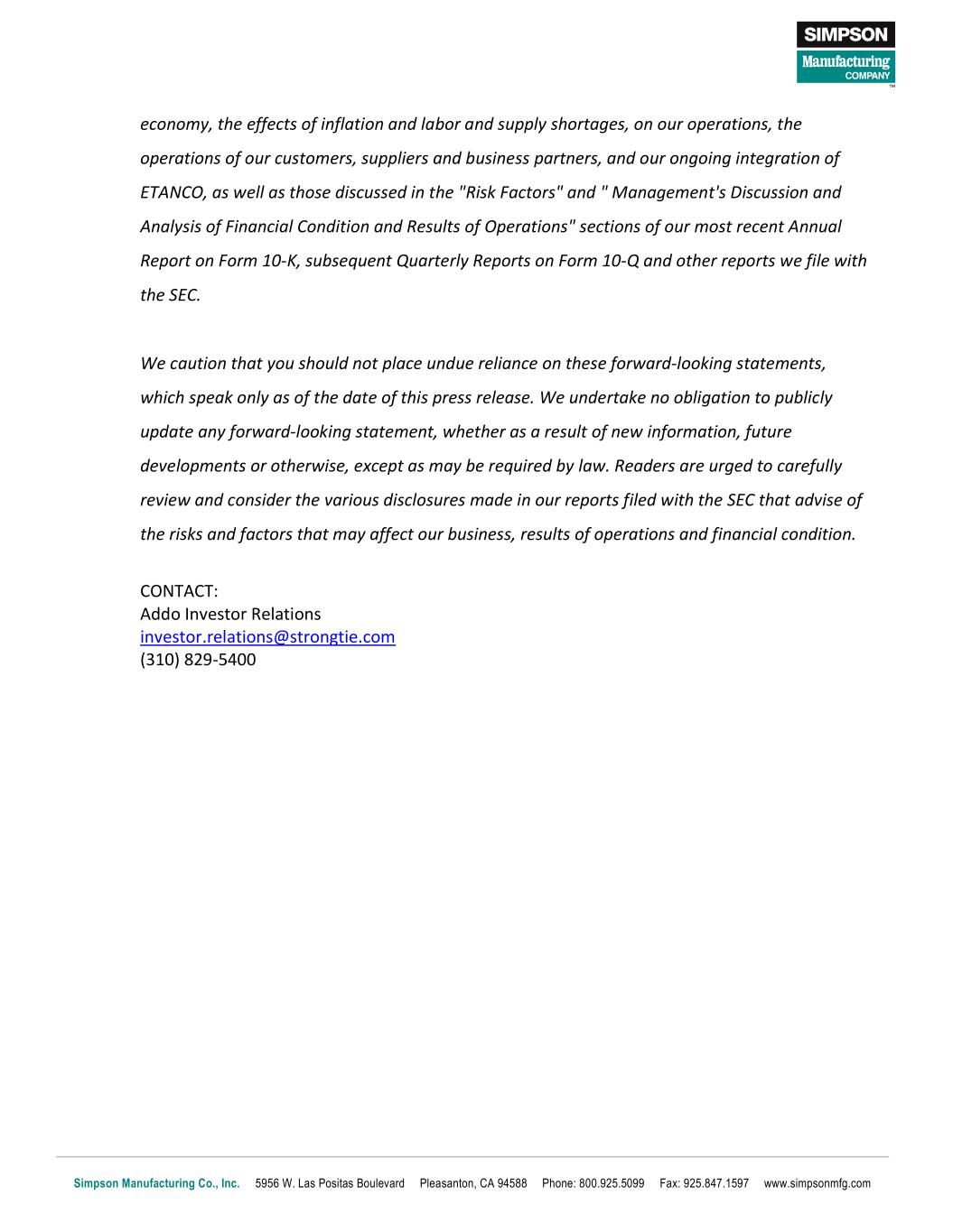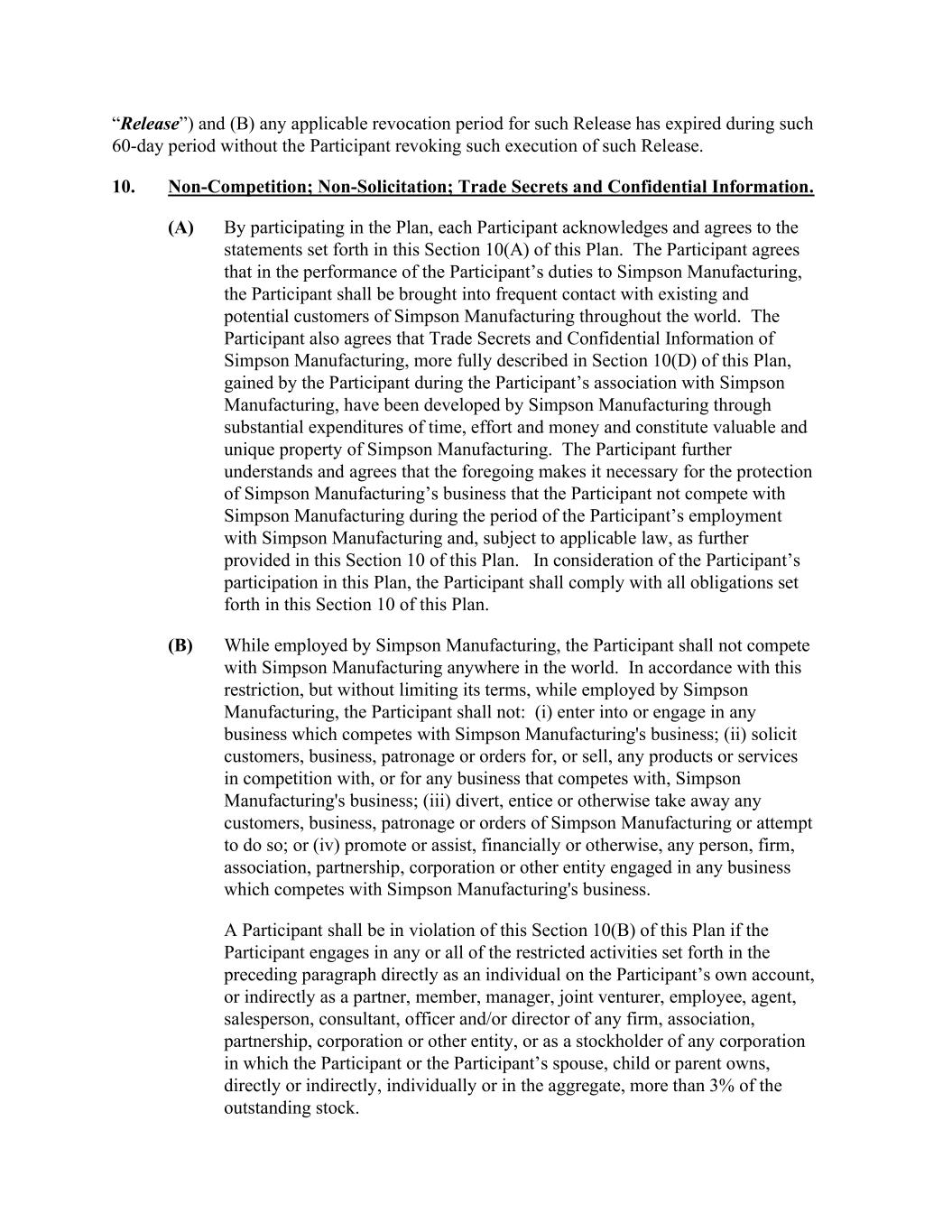 “Release”) and (B) any applicable revocation period for such Release has expired during such 60-day period without the Participant revoking such execution of such Release. 10. Non-Competition; Non-Solicitation; Trade Secrets and Confidential Information. (A) By participating in the Plan, each Participant acknowledges and agrees to the statements set forth in this Section 10(A) of this Plan. The Participant agrees that in the performance of the Participant’s duties to Simpson Manufacturing, the Participant shall be brought into frequent contact with existing and potential customers of Simpson Manufacturing throughout the world. The Participant also agrees that Trade Secrets and Confidential Information of Simpson Manufacturing, more fully described in Section 10(D) of this Plan, gained by the Participant during the Participant’s association with Simpson Manufacturing, have been developed by Simpson Manufacturing through substantial expenditures of time, effort and money and constitute valuable and unique property of Simpson Manufacturing. The Participant further understands and agrees that the foregoing makes it necessary for the protection of Simpson Manufacturing’s business that the Participant not compete with Simpson Manufacturing during the period of the Participant’s employment with Simpson Manufacturing and, subject to applicable law, as further provided in this Section 10 of this Plan. In consideration of the Participant’s participation in this Plan, the Participant shall comply with all obligations set forth in this Section 10 of this Plan. (B) While employed by Simpson Manufacturing, the Participant shall not compete with Simpson Manufacturing anywhere in the world. In accordance with this restriction, but without limiting its terms, while employed by Simpson Manufacturing, the Participant shall not: (i) enter into or engage in any business which competes with Simpson Manufacturing's business; (ii) solicit customers, business, patronage or orders for, or sell, any products or services in competition with, or for any business that competes with, Simpson Manufacturing's business; (iii) divert, entice or otherwise take away any customers, business, patronage or orders of Simpson Manufacturing or attempt to do so; or (iv) promote or assist, financially or otherwise, any person, firm, association, partnership, corporation or other entity engaged in any business which competes with Simpson Manufacturing's business. A Participant shall be in violation of this Section 10(B) of this Plan if the Participant engages in any or all of the restricted activities set forth in the preceding paragraph directly as an individual on the Participant’s own account, or indirectly as a partner, member, manager, joint venturer, employee, agent, salesperson, consultant, officer and/or director of any firm, association, partnership, corporation or other entity, or as a stockholder of any corporation in which the Participant or the Participant’s spouse, child or parent owns, directly or indirectly, individually or in the aggregate, more than 3% of the outstanding stock.