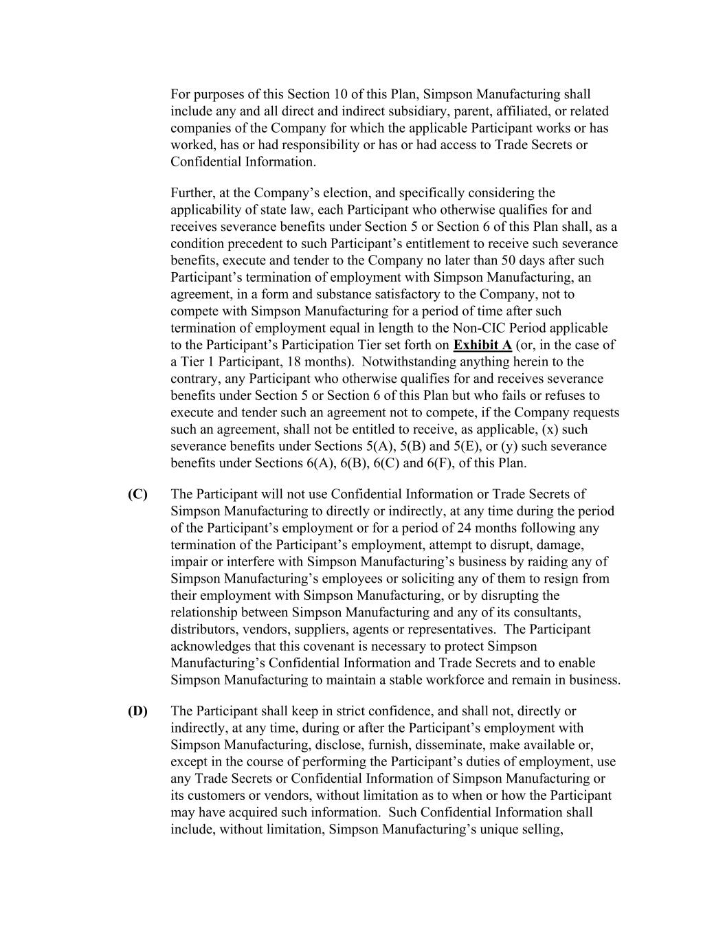 For purposes of this Section 10 of this Plan, Simpson Manufacturing shall include any and all direct and indirect subsidiary, parent, affiliated, or related companies of the Company for which the applicable Participant works or has worked, has or had responsibility or has or had access to Trade Secrets or Confidential Information. Further, at the Company’s election, and specifically considering the applicability of state law, each Participant who otherwise qualifies for and receives severance benefits under Section 5 or Section 6 of this Plan shall, as a condition precedent to such Participant’s entitlement to receive such severance benefits, execute and tender to the Company no later than 50 days after such Participant’s termination of employment with Simpson Manufacturing, an agreement, in a form and substance satisfactory to the Company, not to compete with Simpson Manufacturing for a period of time after such termination of employment equal in length to the Non-CIC Period applicable to the Participant’s Participation Tier set forth on Exhibit A (or, in the case of a Tier 1 Participant, 18 months). Notwithstanding anything herein to the contrary, any Participant who otherwise qualifies for and receives severance benefits under Section 5 or Section 6 of this Plan but who fails or refuses to execute and tender such an agreement not to compete, if the Company requests such an agreement, shall not be entitled to receive, as applicable, (x) such severance benefits under Sections 5(A), 5(B) and 5(E), or (y) such severance benefits under Sections 6(A), 6(B), 6(C) and 6(F), of this Plan. (C) The Participant will not use Confidential Information or Trade Secrets of Simpson Manufacturing to directly or indirectly, at any time during the period of the Participant’s employment or for a period of 24 months following any termination of the Participant’s employment, attempt to disrupt, damage, impair or interfere with Simpson Manufacturing’s business by raiding any of Simpson Manufacturing’s employees or soliciting any of them to resign from their employment with Simpson Manufacturing, or by disrupting the relationship between Simpson Manufacturing and any of its consultants, distributors, vendors, suppliers, agents or representatives. The Participant acknowledges that this covenant is necessary to protect Simpson Manufacturing’s Confidential Information and Trade Secrets and to enable Simpson Manufacturing to maintain a stable workforce and remain in business. (D) The Participant shall keep in strict confidence, and shall not, directly or indirectly, at any time, during or after the Participant’s employment with Simpson Manufacturing, disclose, furnish, disseminate, make available or, except in the course of performing the Participant’s duties of employment, use any Trade Secrets or Confidential Information of Simpson Manufacturing or its customers or vendors, without limitation as to when or how the Participant may have acquired such information. Such Confidential Information shall include, without limitation, Simpson Manufacturing’s unique selling,