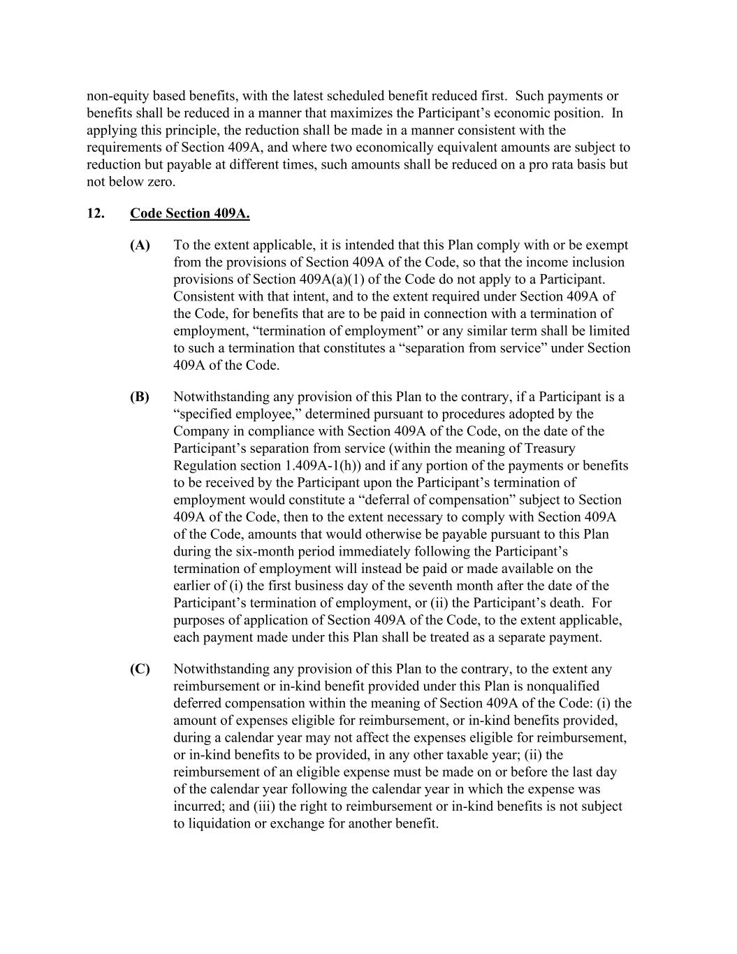 non-equity based benefits, with the latest scheduled benefit reduced first. Such payments or benefits shall be reduced in a manner that maximizes the Participant’s economic position. In applying this principle, the reduction shall be made in a manner consistent with the requirements of Section 409A, and where two economically equivalent amounts are subject to reduction but payable at different times, such amounts shall be reduced on a pro rata basis but not below zero. 12. Code Section 409A. (A) To the extent applicable, it is intended that this Plan comply with or be exempt from the provisions of Section 409A of the Code, so that the income inclusion provisions of Section 409A(a)(1) of the Code do not apply to a Participant. Consistent with that intent, and to the extent required under Section 409A of the Code, for benefits that are to be paid in connection with a termination of employment, “termination of employment” or any similar term shall be limited to such a termination that constitutes a “separation from service” under Section 409A of the Code. (B) Notwithstanding any provision of this Plan to the contrary, if a Participant is a “specified employee,” determined pursuant to procedures adopted by the Company in compliance with Section 409A of the Code, on the date of the Participant’s separation from service (within the meaning of Treasury Regulation section 1.409A-1(h)) and if any portion of the payments or benefits to be received by the Participant upon the Participant’s termination of employment would constitute a “deferral of compensation” subject to Section 409A of the Code, then to the extent necessary to comply with Section 409A of the Code, amounts that would otherwise be payable pursuant to this Plan during the six-month period immediately following the Participant’s termination of employment will instead be paid or made available on the earlier of (i) the first business day of the seventh month after the date of the Participant’s termination of employment, or (ii) the Participant’s death. For purposes of application of Section 409A of the Code, to the extent applicable, each payment made under this Plan shall be treated as a separate payment. (C) Notwithstanding any provision of this Plan to the contrary, to the extent any reimbursement or in-kind benefit provided under this Plan is nonqualified deferred compensation within the meaning of Section 409A of the Code: (i) the amount of expenses eligible for reimbursement, or in-kind benefits provided, during a calendar year may not affect the expenses eligible for reimbursement, or in-kind benefits to be provided, in any other taxable year; (ii) the reimbursement of an eligible expense must be made on or before the last day of the calendar year following the calendar year in which the expense was incurred; and (iii) the right to reimbursement or in-kind benefits is not subject to liquidation or exchange for another benefit.