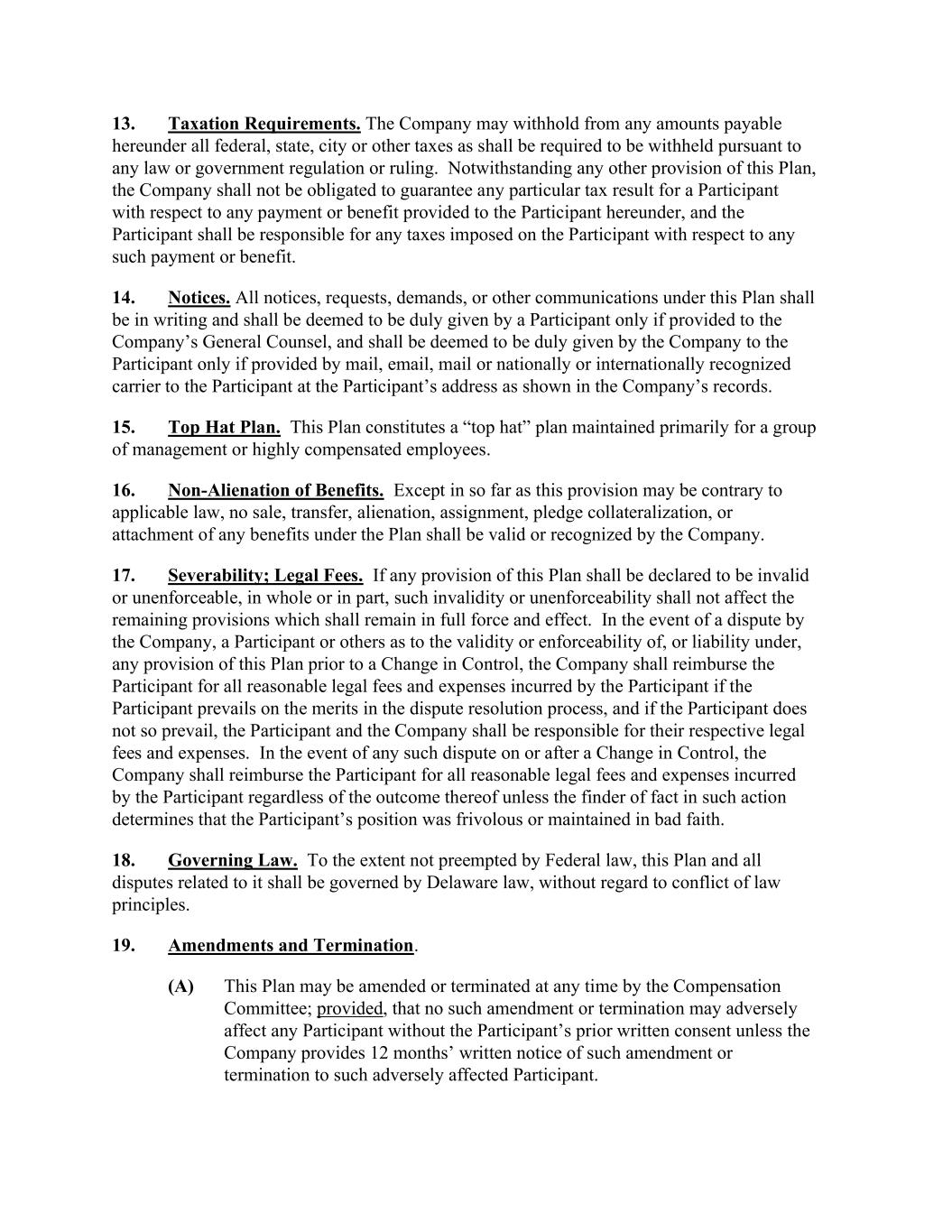 13. Taxation Requirements. The Company may withhold from any amounts payable hereunder all federal, state, city or other taxes as shall be required to be withheld pursuant to any law or government regulation or ruling. Notwithstanding any other provision of this Plan, the Company shall not be obligated to guarantee any particular tax result for a Participant with respect to any payment or benefit provided to the Participant hereunder, and the Participant shall be responsible for any taxes imposed on the Participant with respect to any such payment or benefit. 14. Notices. All notices, requests, demands, or other communications under this Plan shall be in writing and shall be deemed to be duly given by a Participant only if provided to the Company’s General Counsel, and shall be deemed to be duly given by the Company to the Participant only if provided by mail, email, mail or nationally or internationally recognized carrier to the Participant at the Participant’s address as shown in the Company’s records. 15. Top Hat Plan. This Plan constitutes a “top hat” plan maintained primarily for a group of management or highly compensated employees. 16. Non-Alienation of Benefits. Except in so far as this provision may be contrary to applicable law, no sale, transfer, alienation, assignment, pledge collateralization, or attachment of any benefits under the Plan shall be valid or recognized by the Company. 17. Severability; Legal Fees. If any provision of this Plan shall be declared to be invalid or unenforceable, in whole or in part, such invalidity or unenforceability shall not affect the remaining provisions which shall remain in full force and effect. In the event of a dispute by the Company, a Participant or others as to the validity or enforceability of, or liability under, any provision of this Plan prior to a Change in Control, the Company shall reimburse the Participant for all reasonable legal fees and expenses incurred by the Participant if the Participant prevails on the merits in the dispute resolution process, and if the Participant does not so prevail, the Participant and the Company shall be responsible for their respective legal fees and expenses. In the event of any such dispute on or after a Change in Control, the Company shall reimburse the Participant for all reasonable legal fees and expenses incurred by the Participant regardless of the outcome thereof unless the finder of fact in such action determines that the Participant’s position was frivolous or maintained in bad faith. 18. Governing Law. To the extent not preempted by Federal law, this Plan and all disputes related to it shall be governed by Delaware law, without regard to conflict of law principles. 19. Amendments and Termination. (A) This Plan may be amended or terminated at any time by the Compensation Committee; provided, that no such amendment or termination may adversely affect any Participant without the Participant’s prior written consent unless the Company provides 12 months’ written notice of such amendment or termination to such adversely affected Participant.