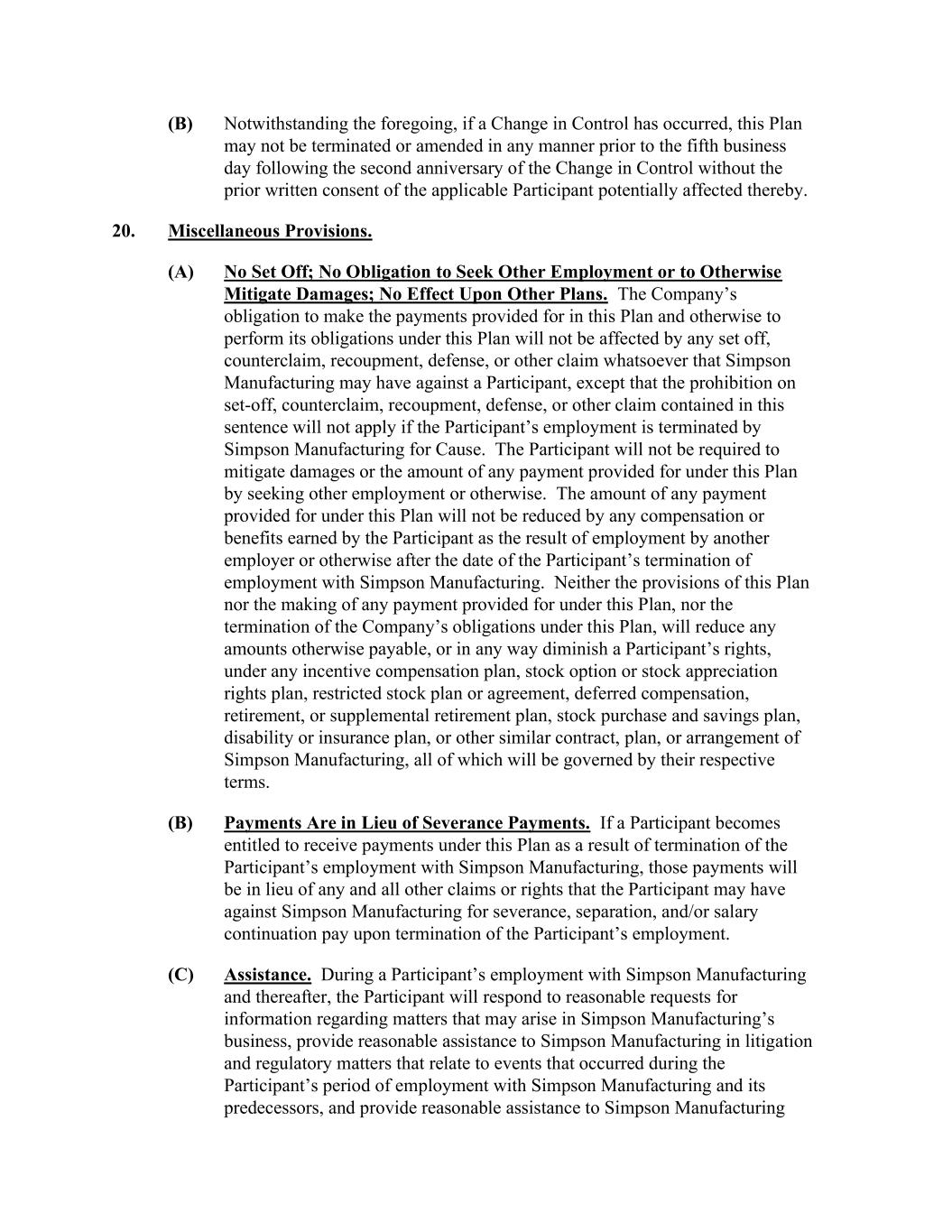 (B) Notwithstanding the foregoing, if a Change in Control has occurred, this Plan may not be terminated or amended in any manner prior to the fifth business day following the second anniversary of the Change in Control without the prior written consent of the applicable Participant potentially affected thereby. 20. Miscellaneous Provisions. (A) No Set Off; No Obligation to Seek Other Employment or to Otherwise Mitigate Damages; No Effect Upon Other Plans. The Company’s obligation to make the payments provided for in this Plan and otherwise to perform its obligations under this Plan will not be affected by any set off, counterclaim, recoupment, defense, or other claim whatsoever that Simpson Manufacturing may have against a Participant, except that the prohibition on set-off, counterclaim, recoupment, defense, or other claim contained in this sentence will not apply if the Participant’s employment is terminated by Simpson Manufacturing for Cause. The Participant will not be required to mitigate damages or the amount of any payment provided for under this Plan by seeking other employment or otherwise. The amount of any payment provided for under this Plan will not be reduced by any compensation or benefits earned by the Participant as the result of employment by another employer or otherwise after the date of the Participant’s termination of employment with Simpson Manufacturing. Neither the provisions of this Plan nor the making of any payment provided for under this Plan, nor the termination of the Company’s obligations under this Plan, will reduce any amounts otherwise payable, or in any way diminish a Participant’s rights, under any incentive compensation plan, stock option or stock appreciation rights plan, restricted stock plan or agreement, deferred compensation, retirement, or supplemental retirement plan, stock purchase and savings plan, disability or insurance plan, or other similar contract, plan, or arrangement of Simpson Manufacturing, all of which will be governed by their respective terms. (B) Payments Are in Lieu of Severance Payments. If a Participant becomes entitled to receive payments under this Plan as a result of termination of the Participant’s employment with Simpson Manufacturing, those payments will be in lieu of any and all other claims or rights that the Participant may have against Simpson Manufacturing for severance, separation, and/or salary continuation pay upon termination of the Participant’s employment. (C) Assistance. During a Participant’s employment with Simpson Manufacturing and thereafter, the Participant will respond to reasonable requests for information regarding matters that may arise in Simpson Manufacturing’s business, provide reasonable assistance to Simpson Manufacturing in litigation and regulatory matters that relate to events that occurred during the Participant’s period of employment with Simpson Manufacturing and its predecessors, and provide reasonable assistance to Simpson Manufacturing