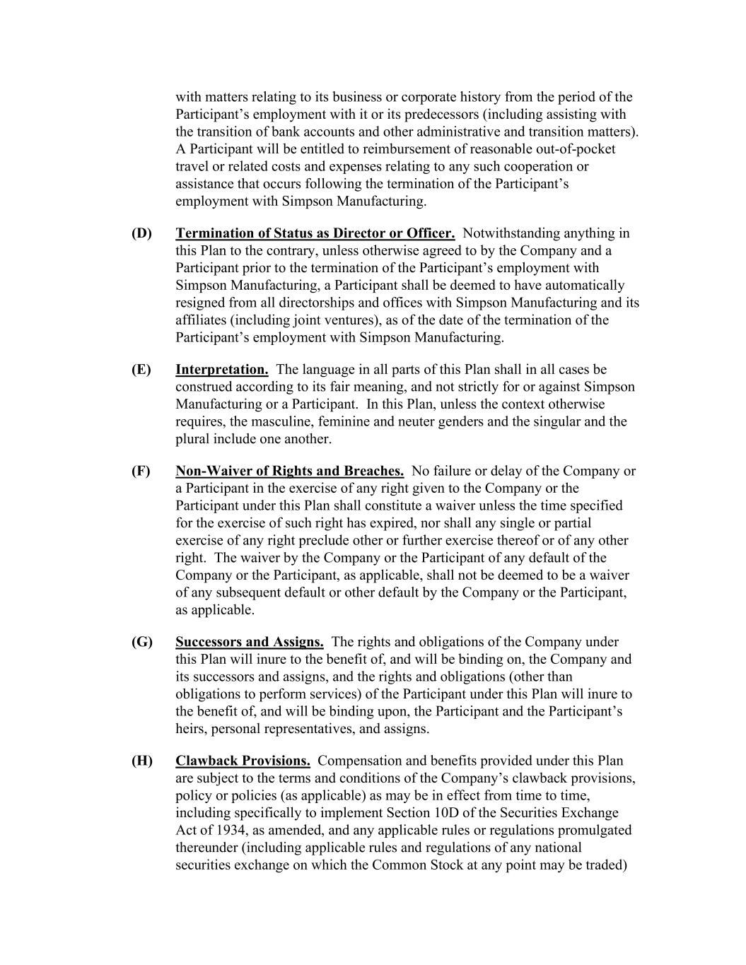 with matters relating to its business or corporate history from the period of the Participant’s employment with it or its predecessors (including assisting with the transition of bank accounts and other administrative and transition matters). A Participant will be entitled to reimbursement of reasonable out-of-pocket travel or related costs and expenses relating to any such cooperation or assistance that occurs following the termination of the Participant’s employment with Simpson Manufacturing. (D) Termination of Status as Director or Officer. Notwithstanding anything in this Plan to the contrary, unless otherwise agreed to by the Company and a Participant prior to the termination of the Participant’s employment with Simpson Manufacturing, a Participant shall be deemed to have automatically resigned from all directorships and offices with Simpson Manufacturing and its affiliates (including joint ventures), as of the date of the termination of the Participant’s employment with Simpson Manufacturing. (E) Interpretation. The language in all parts of this Plan shall in all cases be construed according to its fair meaning, and not strictly for or against Simpson Manufacturing or a Participant. In this Plan, unless the context otherwise requires, the masculine, feminine and neuter genders and the singular and the plural include one another. (F) Non-Waiver of Rights and Breaches. No failure or delay of the Company or a Participant in the exercise of any right given to the Company or the Participant under this Plan shall constitute a waiver unless the time specified for the exercise of such right has expired, nor shall any single or partial exercise of any right preclude other or further exercise thereof or of any other right. The waiver by the Company or the Participant of any default of the Company or the Participant, as applicable, shall not be deemed to be a waiver of any subsequent default or other default by the Company or the Participant, as applicable. (G) Successors and Assigns. The rights and obligations of the Company under this Plan will inure to the benefit of, and will be binding on, the Company and its successors and assigns, and the rights and obligations (other than obligations to perform services) of the Participant under this Plan will inure to the benefit of, and will be binding upon, the Participant and the Participant’s heirs, personal representatives, and assigns. (H) Clawback Provisions. Compensation and benefits provided under this Plan are subject to the terms and conditions of the Company’s clawback provisions, policy or policies (as applicable) as may be in effect from time to time, including specifically to implement Section 10D of the Securities Exchange Act of 1934, as amended, and any applicable rules or regulations promulgated thereunder (including applicable rules and regulations of any national securities exchange on which the Common Stock at any point may be traded)