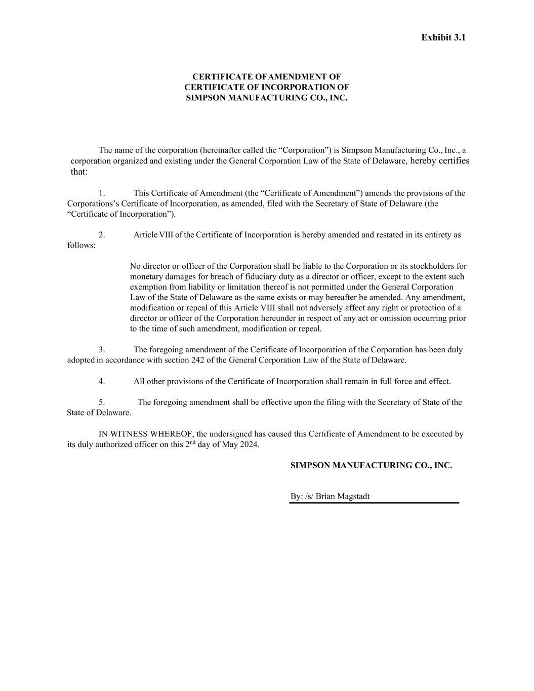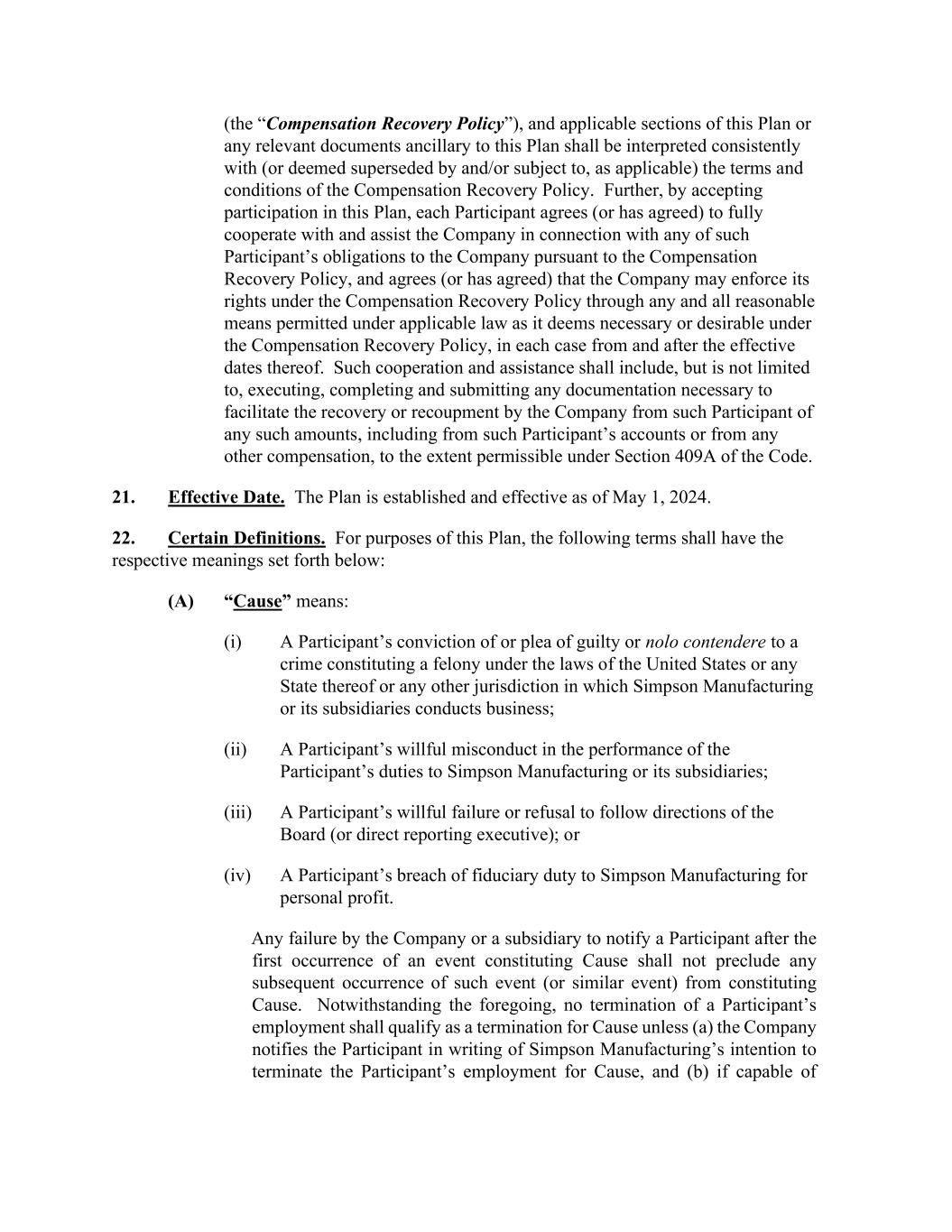 (the “Compensation Recovery Policy”), and applicable sections of this Plan or any relevant documents ancillary to this Plan shall be interpreted consistently with (or deemed superseded by and/or subject to, as applicable) the terms and conditions of the Compensation Recovery Policy. Further, by accepting participation in this Plan, each Participant agrees (or has agreed) to fully cooperate with and assist the Company in connection with any of such Participant’s obligations to the Company pursuant to the Compensation Recovery Policy, and agrees (or has agreed) that the Company may enforce its rights under the Compensation Recovery Policy through any and all reasonable means permitted under applicable law as it deems necessary or desirable under the Compensation Recovery Policy, in each case from and after the effective dates thereof. Such cooperation and assistance shall include, but is not limited to, executing, completing and submitting any documentation necessary to facilitate the recovery or recoupment by the Company from such Participant of any such amounts, including from such Participant’s accounts or from any other compensation, to the extent permissible under Section 409A of the Code. 21. Effective Date. The Plan is established and effective as of May 1, 2024. 22. Certain Definitions. For purposes of this Plan, the following terms shall have the respective meanings set forth below: (A) “Cause” means: (i) A Participant’s conviction of or plea of guilty or nolo contendere to a crime constituting a felony under the laws of the United States or any State thereof or any other jurisdiction in which Simpson Manufacturing or its subsidiaries conducts business; (ii) A Participant’s willful misconduct in the performance of the Participant’s duties to Simpson Manufacturing or its subsidiaries; (iii) A Participant’s willful failure or refusal to follow directions of the Board (or direct reporting executive); or (iv) A Participant’s breach of fiduciary duty to Simpson Manufacturing for personal profit. Any failure by the Company or a subsidiary to notify a Participant after the first occurrence of an event constituting Cause shall not preclude any subsequent occurrence of such event (or similar event) from constituting Cause. Notwithstanding the foregoing, no termination of a Participant’s employment shall qualify as a termination for Cause unless (a) the Company notifies the Participant in writing of Simpson Manufacturing’s intention to terminate the Participant’s employment for Cause, and (b) if capable of