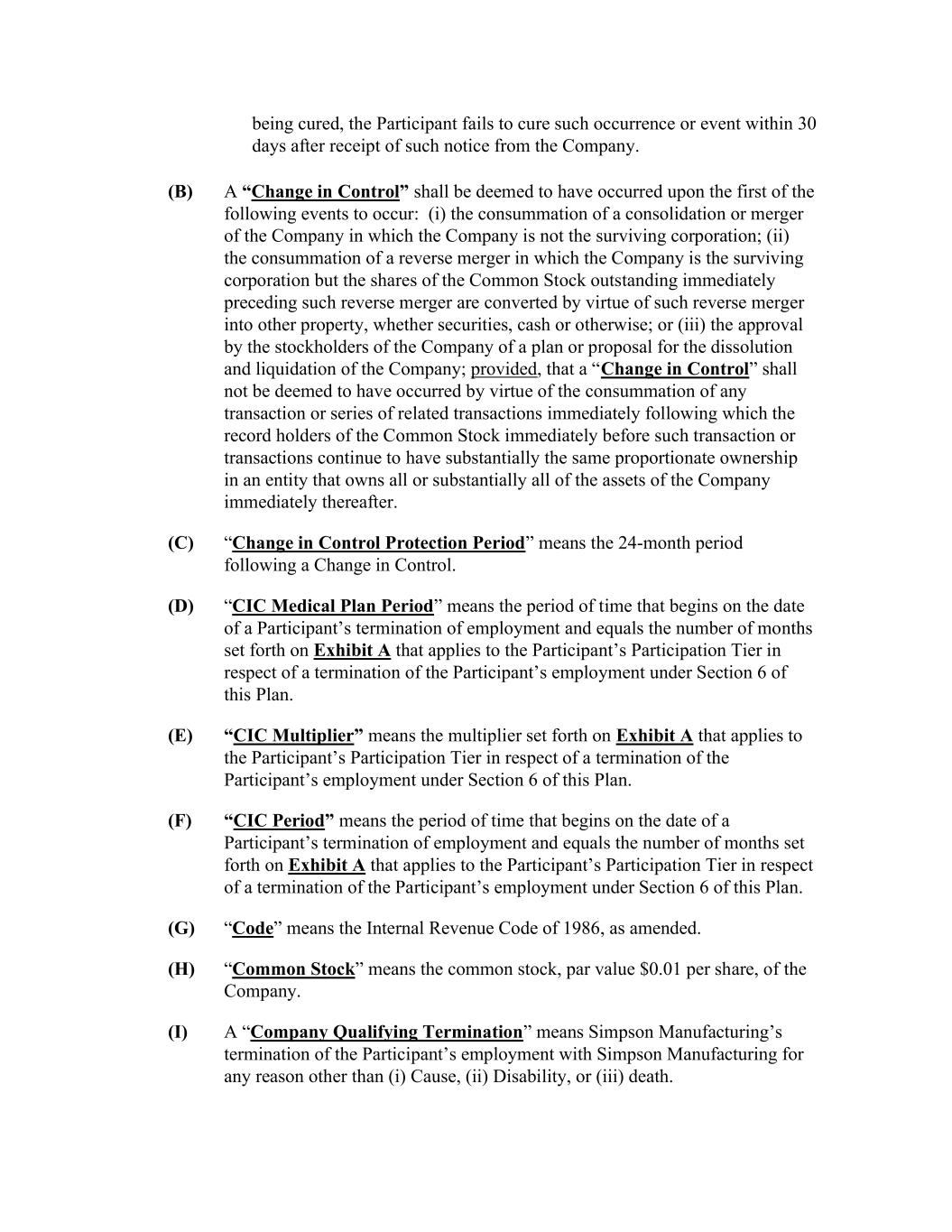 being cured, the Participant fails to cure such occurrence or event within 30 days after receipt of such notice from the Company. (B) A “Change in Control” shall be deemed to have occurred upon the first of the following events to occur: (i) the consummation of a consolidation or merger of the Company in which the Company is not the surviving corporation; (ii) the consummation of a reverse merger in which the Company is the surviving corporation but the shares of the Common Stock outstanding immediately preceding such reverse merger are converted by virtue of such reverse merger into other property, whether securities, cash or otherwise; or (iii) the approval by the stockholders of the Company of a plan or proposal for the dissolution and liquidation of the Company; provided, that a “Change in Control” shall not be deemed to have occurred by virtue of the consummation of any transaction or series of related transactions immediately following which the record holders of the Common Stock immediately before such transaction or transactions continue to have substantially the same proportionate ownership in an entity that owns all or substantially all of the assets of the Company immediately thereafter. (C) “Change in Control Protection Period” means the 24-month period following a Change in Control. (D) “CIC Medical Plan Period” means the period of time that begins on the date of a Participant’s termination of employment and equals the number of months set forth on Exhibit A that applies to the Participant’s Participation Tier in respect of a termination of the Participant’s employment under Section 6 of this Plan. (E) “CIC Multiplier” means the multiplier set forth on Exhibit A that applies to the Participant’s Participation Tier in respect of a termination of the Participant’s employment under Section 6 of this Plan. (F) “CIC Period” means the period of time that begins on the date of a Participant’s termination of employment and equals the number of months set forth on Exhibit A that applies to the Participant’s Participation Tier in respect of a termination of the Participant’s employment under Section 6 of this Plan. (G) “Code” means the Internal Revenue Code of 1986, as amended. (H) “Common Stock” means the common stock, par value $0.01 per share, of the Company. (I) A “Company Qualifying Termination” means Simpson Manufacturing’s termination of the Participant’s employment with Simpson Manufacturing for any reason other than (i) Cause, (ii) Disability, or (iii) death.