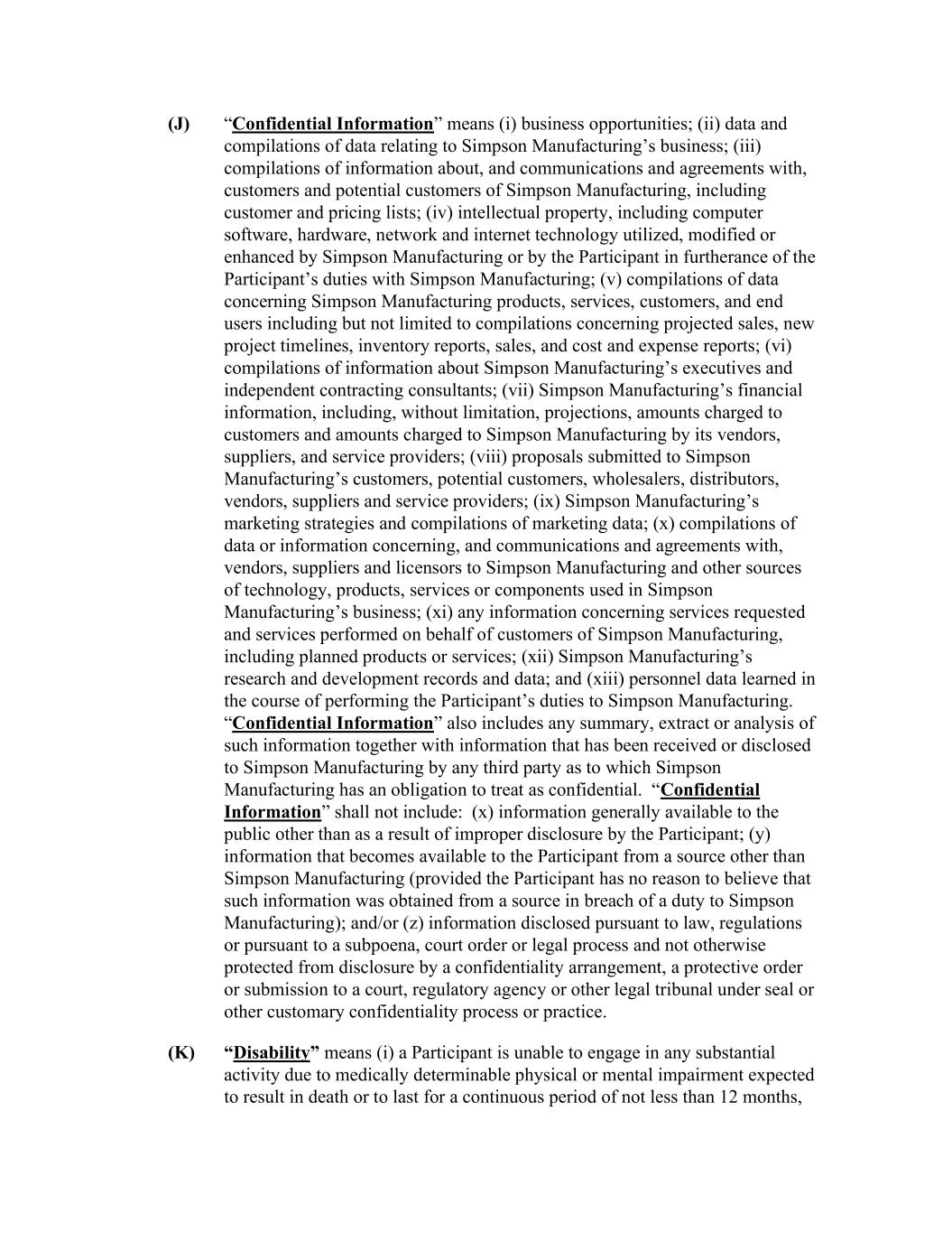 (J) “Confidential Information” means (i) business opportunities; (ii) data and compilations of data relating to Simpson Manufacturing’s business; (iii) compilations of information about, and communications and agreements with, customers and potential customers of Simpson Manufacturing, including customer and pricing lists; (iv) intellectual property, including computer software, hardware, network and internet technology utilized, modified or enhanced by Simpson Manufacturing or by the Participant in furtherance of the Participant’s duties with Simpson Manufacturing; (v) compilations of data concerning Simpson Manufacturing products, services, customers, and end users including but not limited to compilations concerning projected sales, new project timelines, inventory reports, sales, and cost and expense reports; (vi) compilations of information about Simpson Manufacturing’s executives and independent contracting consultants; (vii) Simpson Manufacturing’s financial information, including, without limitation, projections, amounts charged to customers and amounts charged to Simpson Manufacturing by its vendors, suppliers, and service providers; (viii) proposals submitted to Simpson Manufacturing’s customers, potential customers, wholesalers, distributors, vendors, suppliers and service providers; (ix) Simpson Manufacturing’s marketing strategies and compilations of marketing data; (x) compilations of data or information concerning, and communications and agreements with, vendors, suppliers and licensors to Simpson Manufacturing and other sources of technology, products, services or components used in Simpson Manufacturing’s business; (xi) any information concerning services requested and services performed on behalf of customers of Simpson Manufacturing, including planned products or services; (xii) Simpson Manufacturing’s research and development records and data; and (xiii) personnel data learned in the course of performing the Participant’s duties to Simpson Manufacturing. “Confidential Information” also includes any summary, extract or analysis of such information together with information that has been received or disclosed to Simpson Manufacturing by any third party as to which Simpson Manufacturing has an obligation to treat as confidential. “Confidential Information” shall not include: (x) information generally available to the public other than as a result of improper disclosure by the Participant; (y) information that becomes available to the Participant from a source other than Simpson Manufacturing (provided the Participant has no reason to believe that such information was obtained from a source in breach of a duty to Simpson Manufacturing); and/or (z) information disclosed pursuant to law, regulations or pursuant to a subpoena, court order or legal process and not otherwise protected from disclosure by a confidentiality arrangement, a protective order or submission to a court, regulatory agency or other legal tribunal under seal or other customary confidentiality process or practice. (K) “Disability” means (i) a Participant is unable to engage in any substantial activity due to medically determinable physical or mental impairment expected to result in death or to last for a continuous period of not less than 12 months,