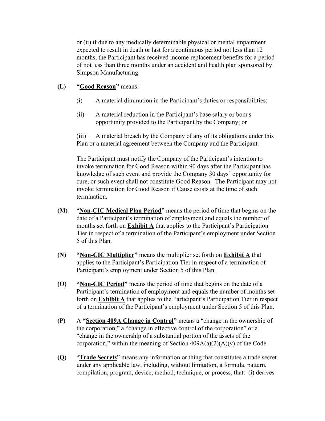 or (ii) if due to any medically determinable physical or mental impairment expected to result in death or last for a continuous period not less than 12 months, the Participant has received income replacement benefits for a period of not less than three months under an accident and health plan sponsored by Simpson Manufacturing. (L) “Good Reason” means: (i) A material diminution in the Participant’s duties or responsibilities; (ii) A material reduction in the Participant’s base salary or bonus opportunity provided to the Participant by the Company; or (iii) A material breach by the Company of any of its obligations under this Plan or a material agreement between the Company and the Participant. The Participant must notify the Company of the Participant’s intention to invoke termination for Good Reason within 90 days after the Participant has knowledge of such event and provide the Company 30 days’ opportunity for cure, or such event shall not constitute Good Reason. The Participant may not invoke termination for Good Reason if Cause exists at the time of such termination. (M) “Non-CIC Medical Plan Period” means the period of time that begins on the date of a Participant’s termination of employment and equals the number of months set forth on Exhibit A that applies to the Participant’s Participation Tier in respect of a termination of the Participant’s employment under Section 5 of this Plan. (N) “Non-CIC Multiplier” means the multiplier set forth on Exhibit A that applies to the Participant’s Participation Tier in respect of a termination of Participant’s employment under Section 5 of this Plan. (O) “Non-CIC Period” means the period of time that begins on the date of a Participant’s termination of employment and equals the number of months set forth on Exhibit A that applies to the Participant’s Participation Tier in respect of a termination of the Participant’s employment under Section 5 of this Plan. (P) A “Section 409A Change in Control” means a “change in the ownership of the corporation,” a “change in effective control of the corporation” or a “change in the ownership of a substantial portion of the assets of the corporation,” within the meaning of Section 409A(a)(2)(A)(v) of the Code. (Q) “Trade Secrets” means any information or thing that constitutes a trade secret under any applicable law, including, without limitation, a formula, pattern, compilation, program, device, method, technique, or process, that: (i) derives