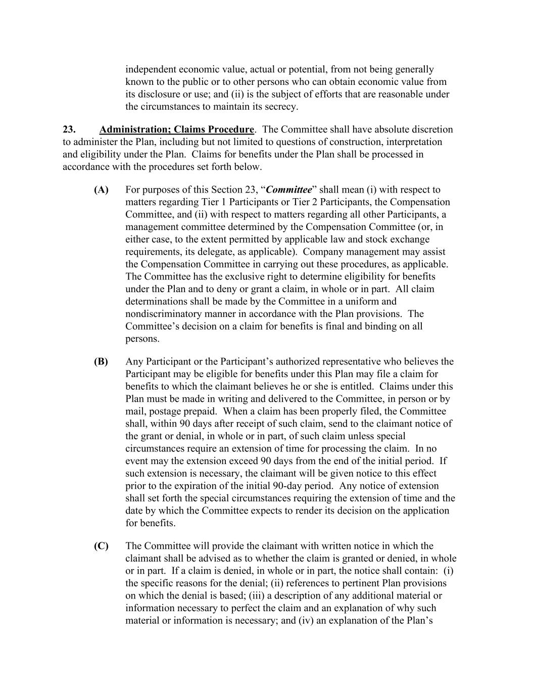 independent economic value, actual or potential, from not being generally known to the public or to other persons who can obtain economic value from its disclosure or use; and (ii) is the subject of efforts that are reasonable under the circumstances to maintain its secrecy. 23. Administration; Claims Procedure. The Committee shall have absolute discretion to administer the Plan, including but not limited to questions of construction, interpretation and eligibility under the Plan. Claims for benefits under the Plan shall be processed in accordance with the procedures set forth below. (A) For purposes of this Section 23, “Committee” shall mean (i) with respect to matters regarding Tier 1 Participants or Tier 2 Participants, the Compensation Committee, and (ii) with respect to matters regarding all other Participants, a management committee determined by the Compensation Committee (or, in either case, to the extent permitted by applicable law and stock exchange requirements, its delegate, as applicable). Company management may assist the Compensation Committee in carrying out these procedures, as applicable. The Committee has the exclusive right to determine eligibility for benefits under the Plan and to deny or grant a claim, in whole or in part. All claim determinations shall be made by the Committee in a uniform and nondiscriminatory manner in accordance with the Plan provisions. The Committee’s decision on a claim for benefits is final and binding on all persons. (B) Any Participant or the Participant’s authorized representative who believes the Participant may be eligible for benefits under this Plan may file a claim for benefits to which the claimant believes he or she is entitled. Claims under this Plan must be made in writing and delivered to the Committee, in person or by mail, postage prepaid. When a claim has been properly filed, the Committee shall, within 90 days after receipt of such claim, send to the claimant notice of the grant or denial, in whole or in part, of such claim unless special circumstances require an extension of time for processing the claim. In no event may the extension exceed 90 days from the end of the initial period. If such extension is necessary, the claimant will be given notice to this effect prior to the expiration of the initial 90-day period. Any notice of extension shall set forth the special circumstances requiring the extension of time and the date by which the Committee expects to render its decision on the application for benefits. (C) The Committee will provide the claimant with written notice in which the claimant shall be advised as to whether the claim is granted or denied, in whole or in part. If a claim is denied, in whole or in part, the notice shall contain: (i) the specific reasons for the denial; (ii) references to pertinent Plan provisions on which the denial is based; (iii) a description of any additional material or information necessary to perfect the claim and an explanation of why such material or information is necessary; and (iv) an explanation of the Plan’s