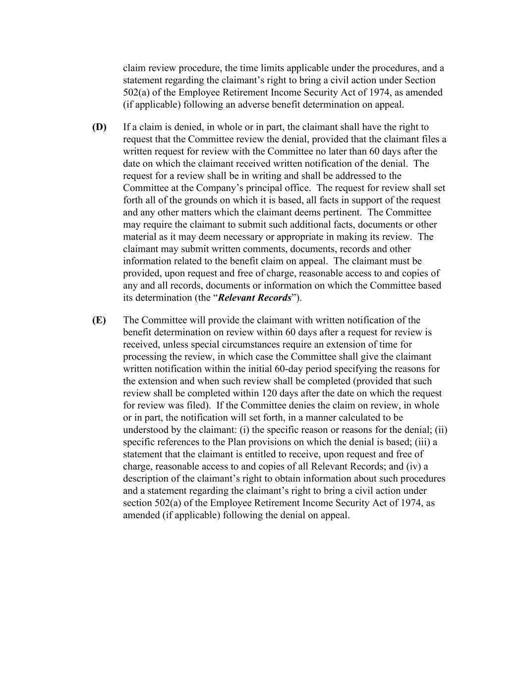 claim review procedure, the time limits applicable under the procedures, and a statement regarding the claimant’s right to bring a civil action under Section 502(a) of the Employee Retirement Income Security Act of 1974, as amended (if applicable) following an adverse benefit determination on appeal. (D) If a claim is denied, in whole or in part, the claimant shall have the right to request that the Committee review the denial, provided that the claimant files a written request for review with the Committee no later than 60 days after the date on which the claimant received written notification of the denial. The request for a review shall be in writing and shall be addressed to the Committee at the Company’s principal office. The request for review shall set forth all of the grounds on which it is based, all facts in support of the request and any other matters which the claimant deems pertinent. The Committee may require the claimant to submit such additional facts, documents or other material as it may deem necessary or appropriate in making its review. The claimant may submit written comments, documents, records and other information related to the benefit claim on appeal. The claimant must be provided, upon request and free of charge, reasonable access to and copies of any and all records, documents or information on which the Committee based its determination (the “Relevant Records”). (E) The Committee will provide the claimant with written notification of the benefit determination on review within 60 days after a request for review is received, unless special circumstances require an extension of time for processing the review, in which case the Committee shall give the claimant written notification within the initial 60-day period specifying the reasons for the extension and when such review shall be completed (provided that such review shall be completed within 120 days after the date on which the request for review was filed). If the Committee denies the claim on review, in whole or in part, the notification will set forth, in a manner calculated to be understood by the claimant: (i) the specific reason or reasons for the denial; (ii) specific references to the Plan provisions on which the denial is based; (iii) a statement that the claimant is entitled to receive, upon request and free of charge, reasonable access to and copies of all Relevant Records; and (iv) a description of the claimant’s right to obtain information about such procedures and a statement regarding the claimant’s right to bring a civil action under section 502(a) of the Employee Retirement Income Security Act of 1974, as amended (if applicable) following the denial on appeal.