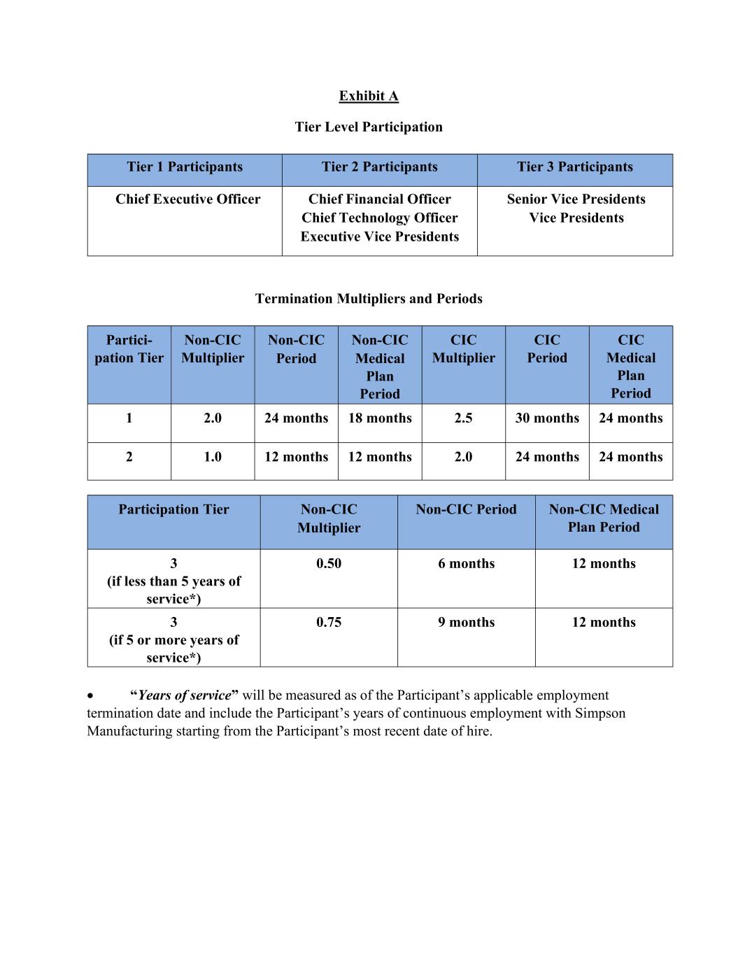 Exhibit A Tier Level Participation Tier 1 Participants Tier 2 Participants Tier 3 Participants Chief Executive Officer Chief Financial Officer Chief Technology Officer Executive Vice Presidents Senior Vice Presidents Vice Presidents Termination Multipliers and Periods Partici- pation Tier Non-CIC Multiplier Non-CIC Period Non-CIC Medical Plan Period CIC Multiplier CIC Period CIC Medical Plan Period 1 2.0 24 months 18 months 2.5 30 months 24 months 2 1.0 12 months 12 months 2.0 24 months 24 months Participation Tier Non-CIC Multiplier Non-CIC Period Non-CIC Medical Plan Period 3 (if less than 5 years of service*) 0.50 6 months 12 months 3 (if 5 or more years of service*) 0.75 9 months 12 months “Years of service” will be measured as of the Participant’s applicable employment termination date and include the Participant’s years of continuous employment with Simpson Manufacturing starting from the Participant’s most recent date of hire.
