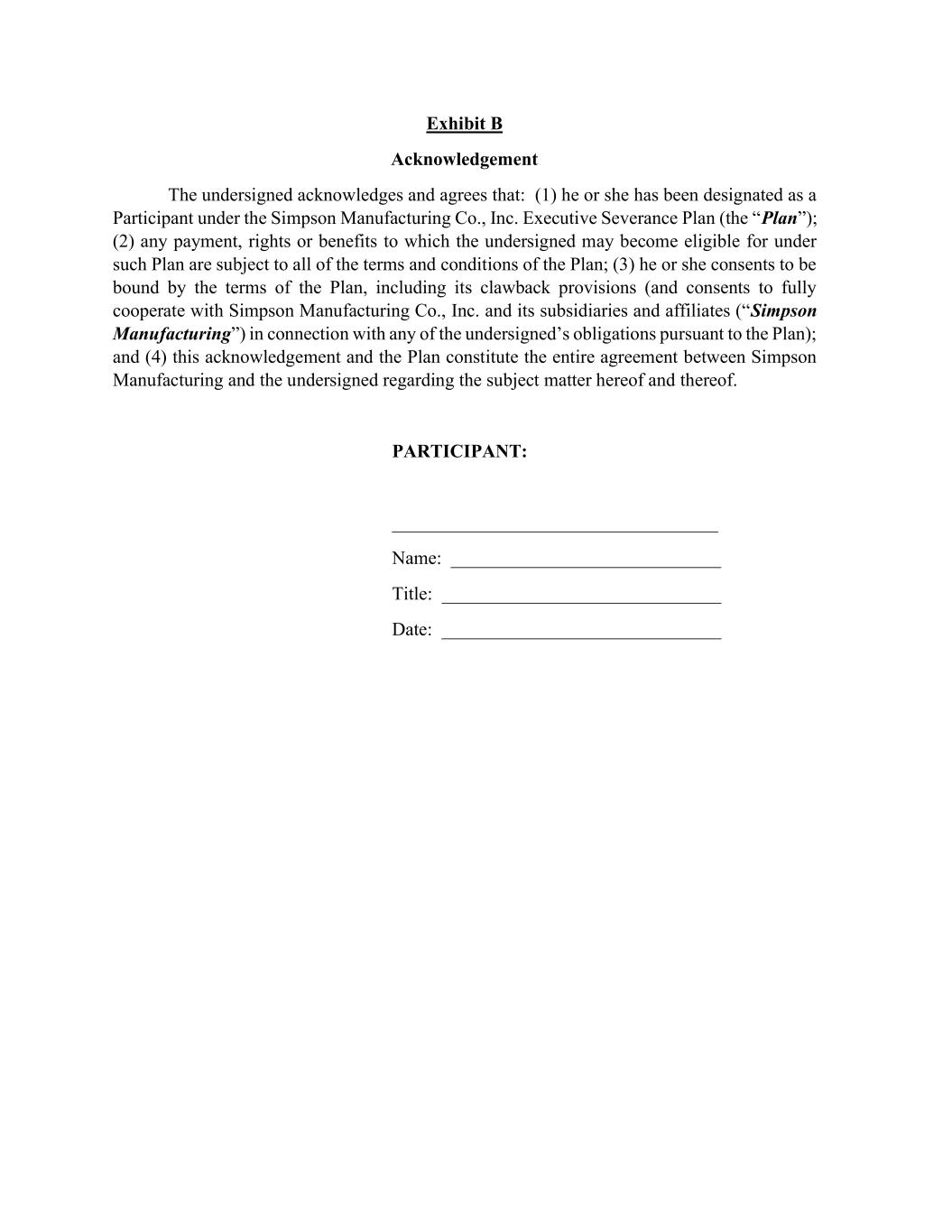 Exhibit B Acknowledgement The undersigned acknowledges and agrees that: (1) he or she has been designated as a Participant under the Simpson Manufacturing Co., Inc. Executive Severance Plan (the “Plan”); (2) any payment, rights or benefits to which the undersigned may become eligible for under such Plan are subject to all of the terms and conditions of the Plan; (3) he or she consents to be bound by the terms of the Plan, including its clawback provisions (and consents to fully cooperate with Simpson Manufacturing Co., Inc. and its subsidiaries and affiliates (“Simpson Manufacturing”) in connection with any of the undersigned’s obligations pursuant to the Plan); and (4) this acknowledgement and the Plan constitute the entire agreement between Simpson Manufacturing and the undersigned regarding the subject matter hereof and thereof. PARTICIPANT: ___________________________________ Name: _____________________________ Title: ______________________________ Date: ______________________________