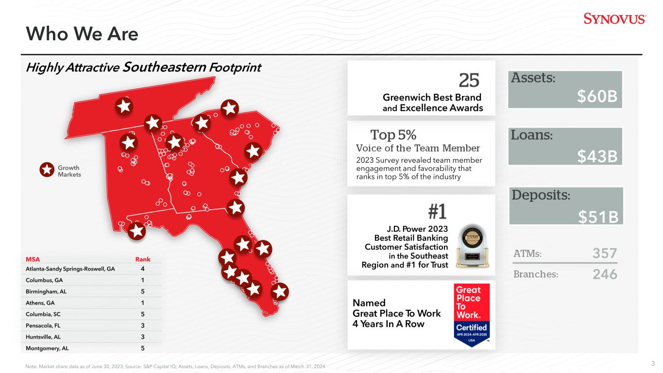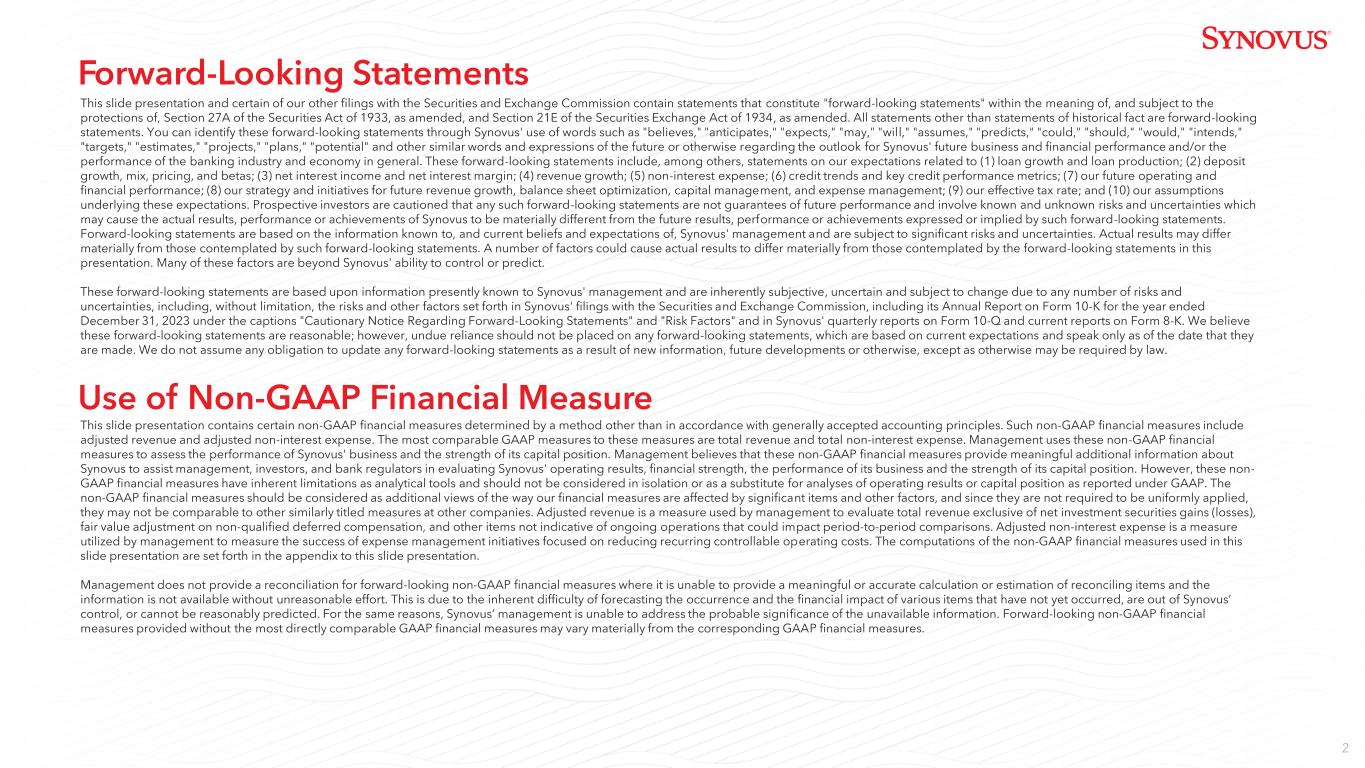 2 This slide presentation and certain of our other filings with the Securities and Exchange Commission contain statements that constitute "forward-looking statements" within the meaning of, and subject to the protections of, Section 27A of the Securities Act of 1933, as amended, and Section 21E of the Securities Exchange Act of 1934, as amended. All statements other than statements of historical fact are forward-looking statements. You can identify these forward-looking statements through Synovus' use of words such as "believes," "anticipates," "expects," "may," "will," "assumes," "predicts," "could," "should," "would," "intends," "targets," "estimates," "projects," "plans," "potential" and other similar words and expressions of the future or otherwise regarding the outlook for Synovus' future business and financial performance and/or the performance of the banking industry and economy in general. These forward-looking statements include, among others, statements on our expectations related to (1) loan growth and loan production; (2) deposit growth, mix, pricing, and betas; (3) net interest income and net interest margin; (4) revenue growth; (5) non-interest expense; (6) credit trends and key credit performance metrics; (7) our future operating and financial performance; (8) our strategy and initiatives for future revenue growth, balance sheet optimization, capital management, and expense management; (9) our effective tax rate; and (10) our assumptions underlying these expectations. Prospective investors are cautioned that any such forward-looking statements are not guarantees of future performance and involve known and unknown risks and uncertainties which may cause the actual results, performance or achievements of Synovus to be materially different from the future results, performance or achievements expressed or implied by such forward-looking statements. Forward-looking statements are based on the information known to, and current beliefs and expectations of, Synovus' management and are subject to significant risks and uncertainties. Actual results may differ materially from those contemplated by such forward-looking statements. A number of factors could cause actual results to differ materially from those contemplated by the forward-looking statements in this presentation. Many of these factors are beyond Synovus' ability to control or predict. These forward-looking statements are based upon information presently known to Synovus' management and are inherently subjective, uncertain and subject to change due to any number of risks and uncertainties, including, without limitation, the risks and other factors set forth in Synovus' filings with the Securities and Exchange Commission, including its Annual Report on Form 10-K for the year ended December 31, 2023 under the captions "Cautionary Notice Regarding Forward-Looking Statements" and "Risk Factors" and in Synovus' quarterly reports on Form 10-Q and current reports on Form 8-K. We believe these forward-looking statements are reasonable; however, undue reliance should not be placed on any forward-looking statements, which are based on current expectations and speak only as of the date that they are made. We do not assume any obligation to update any forward-looking statements as a result of new information, future developments or otherwise, except as otherwise may be required by law. This slide presentation contains certain non-GAAP financial measures determined by a method other than in accordance with generally accepted accounting principles. Such non-GAAP financial measures include adjusted revenue and adjusted non-interest expense. The most comparable GAAP measures to these measures are total revenue and total non-interest expense. Management uses these non-GAAP financial measures to assess the performance of Synovus' business and the strength of its capital position. Management believes that these non-GAAP financial measures provide meaningful additional information about Synovus to assist management, investors, and bank regulators in evaluating Synovus' operating results, financial strength, the performance of its business and the strength of its capital position. However, these non- GAAP financial measures have inherent limitations as analytical tools and should not be considered in isolation or as a substitute for analyses of operating results or capital position as reported under GAAP. The non-GAAP financial measures should be considered as additional views of the way our financial measures are affected by significant items and other factors, and since they are not required to be uniformly applied, they may not be comparable to other similarly titled measures at other companies. Adjusted revenue is a measure used by management to evaluate total revenue exclusive of net investment securities gains (losses), fair value adjustment on non-qualified deferred compensation, and other items not indicative of ongoing operations that could impact period-to-period comparisons. Adjusted non-interest expense is a measure utilized by management to measure the success of expense management initiatives focused on reducing recurring controllable operating costs. The computations of the non-GAAP financial measures used in this slide presentation are set forth in the appendix to this slide presentation. Management does not provide a reconciliation for forward-looking non-GAAP financial measures where it is unable to provide a meaningful or accurate calculation or estimation of reconciling items and the information is not available without unreasonable effort. This is due to the inherent difficulty of forecasting the occurrence and the financial impact of various items that have not yet occurred, are out of Synovus’ control, or cannot be reasonably predicted. For the same reasons, Synovus’ management is unable to address the probable significance of the unavailable information. Forward-looking non-GAAP financial measures provided without t