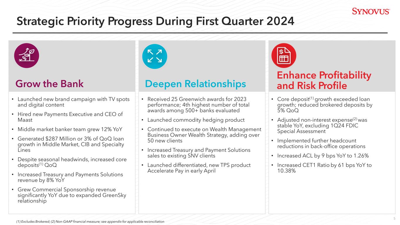 Wholesale Bank Corporate & Investment Bank Community Bank Consumer Bank Financial Management Services 4 Major Lines of Business • Middle Market Lending • CRE Lending • Specialty Lending – Senior Housing – Restaurant Services – Lender Finance – Insurance Premium Finance • Public Funds • Sectors Served: – Financial Institutions – Healthcare – Technology, Media & Communications • Private Capital and M&A Advisory • Commercial and SBA Lending • Private Wealth Management • Banking-As-A-Service • Merchant Services • Consumer Lending • Small Business Lending • Online Origination • 246 Branch Offices • Mortgage Lending • Brokerage Services • Personal and Institutional Trust Services • Treasury Services; Commercial Card; International • Integrated Payments launching in 2024 • ~$10 Billion in Commercial Analysis Balances • Further Growth Expected from Middle Market and CIB Build-Out • Implementing New Syndication Platform to Allow for Greater Scale • Swaps; Foreign Exchange; Lead Agent/Syndication Capabilities; Commodity Hedging Note: Loan, Deposit, and Branch Information as of March 31, 2024 Loans $25B Deposits $13B Loans $0.7B Deposits $0.1B Loans $8B Deposits $11B Loans $3B Deposits $19B Loans $5B Deposits $2B 2023 Non-Interest Revenue $195M 2023 Non-Interest Revenue $80M 2023 Non-Interest Revenue $32MCapital Markets Treasury & Payment Solutions