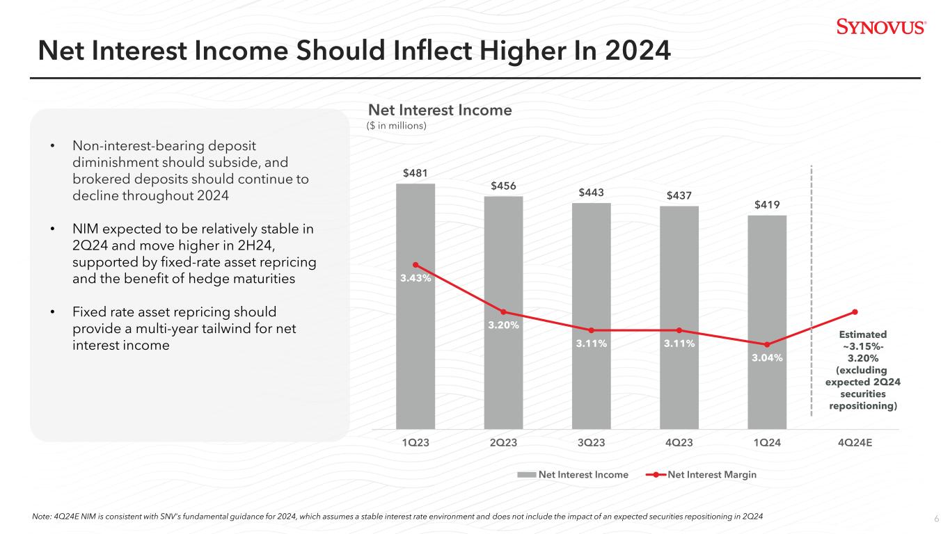 5 Strategic Priority Progress During First Quarter 2024 • Core deposit(1) growth exceeded loan growth; reduced brokered deposits by 5% QoQ • Adjusted non-interest expense(2) was stable YoY, excluding 1Q24 FDIC Special Assessment • Implemented further headcount reductions in back-office operations • Increased ACL by 9 bps YoY to 1.26% • Increased CET1 Ratio by 61 bps YoY to 10.38% Deepen RelationshipsGrow the Bank • Received 25 Greenwich awards for 2023 performance; 4th highest number of total awards among 500+ banks evaluated • Launched commodity hedging product • Continued to execute on Wealth Management Business Owner Wealth Strategy, adding over 50 new clients • Increased Treasury and Payment Solutions sales to existing SNV clients • Launched differentiated, new TPS product Accelerate Pay in early April • Launched new brand campaign with TV spots and digital content • Hired new Payments Executive and CEO of Maast • Middle market banker team grew 12% YoY • Generated $287 Million or 3% of QoQ loan growth in Middle Market, CIB and Specialty Lines • Despite seasonal headwinds, increased core deposits(1) QoQ • Increased Treasury and Payments Solutions revenue by 8% YoY • Grew Commercial Sponsorship revenue significantly YoY due to expanded GreenSky relationship Enhance Profitability and Risk Profile (1) Excludes Brokered; (2) Non-GAAP financial measure; see appendix for applicable reconciliation