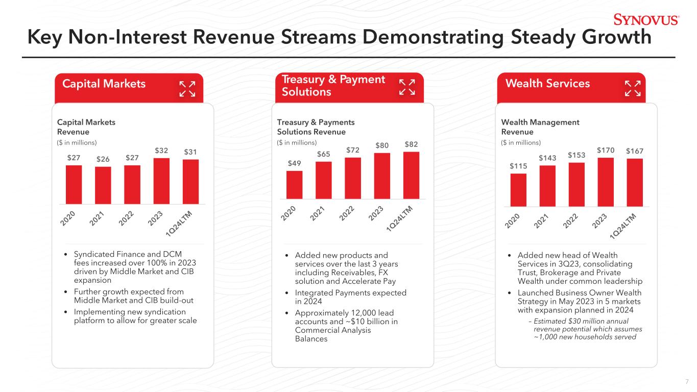 6 • Non-interest-bearing deposit diminishment should subside, and brokered deposits should continue to decline throughout 2024 • NIM expected to be relatively stable in 2Q24 and move higher in 2H24, supported by fixed-rate asset repricing and the benefit of hedge maturities • Fixed rate asset repricing should provide a multi-year tailwind for net interest income Net Interest Income ($ in millions) Net Interest Income Should Inflect Higher In 2024 Note: 4Q24E NIM is consistent with SNV's fundamental guidance for 2024, which assumes a stable interest rate environment and does not include the impact of an expected securities repositioning in 2Q24 $481 $456 $443 $437 $419 3.43% 3.20% 3.11% 3.11% 3.04% 1Q23 2Q23 3Q23 4Q23 1Q24 4Q24E Net Interest Income Net Interest Margin Estimated ~3.15%- 3.20% (excluding expected 2Q24 securities repositioning)