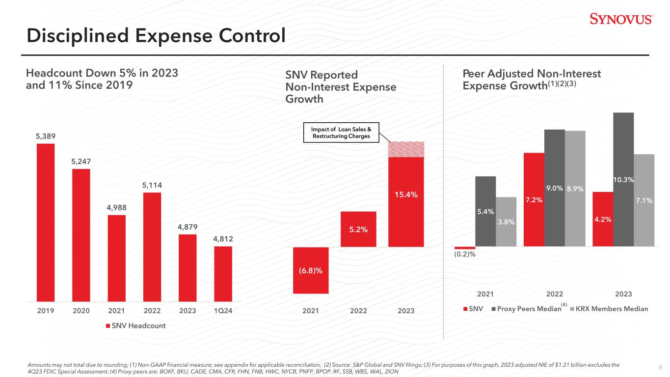 7 Treasury & Payment Solutions • Added new products and services over the last 3 years including Receivables, FX solution and Accelerate Pay • Integrated Payments expected in 2024 • Approximately 12,000 lead accounts and ~$10 billion in Commercial Analysis Balances Capital Markets • Syndicated Finance and DCM fees increased over 100% in 2023 driven by Middle Market and CIB expansion • Further growth expected from Middle Market and CIB build-out • Implementing new syndication platform to allow for greater scale Wealth Services • Added new head of Wealth Services in 3Q23, consolidating Trust, Brokerage and Private Wealth under common leadership • Launched Business Owner Wealth Strategy in May 2023 in 5 markets with expansion planned in 2024 – Estimated $30 million annual revenue potential which assumes ~1,000 new households served Capital Markets Revenue ($ in millions) Treasury & Payments Solutions Revenue ($ in millions) Wealth Management Revenue ($ in millions) Key Non-Interest Revenue Streams Demonstrating Steady Growth $27 $26 $27 $32 $31 $49 $65 $72 $80 $82 $115 $143 $153 $170 $167