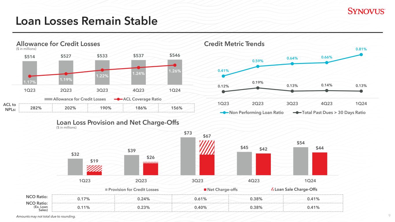8 (0.2)% 7.2% 4.2% 5.4% 9.0% 10.3% 3.8% 8.9% 7.1% 2021 2022 2023 SNV Proxy Peers Median KRX Members Median (6.8)% 5.2% 15.4% 2021 2022 2023 Amounts may not total due to rounding; (1) Non-GAAP financial measure; see appendix for applicable reconciliation; (2) Source: S&P Global and SNV filings; (3) For purposes of this graph, 2023 adjusted NIE of $1.21 billion excludes the 4Q23 FDIC Special Assessment; (4) Proxy peers are: BOKF, BKU, CADE, CMA, CFR, FHN, FNB, HWC, NYCB, PNFP, BPOP, RF, SSB, WBS, WAL, ZION Headcount Down 5% in 2023 and 11% Since 2019 Disciplined Expense Control 5,389 5,247 4,988 5,114 4,879 4,812 2019 2020 2021 2022 2023 1Q24 SNV Headcount Impact of Loan Sales & Restructuring Charges Peer Adjusted Non-Interest Expense Growth(1)(2)(3) (4) SNV Reported Non-Interest Expense Growth