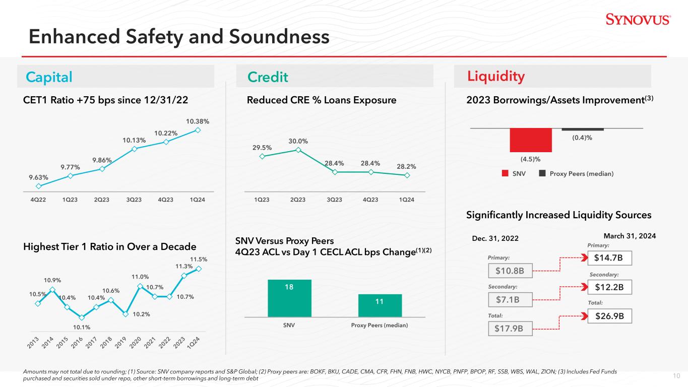 9 $514 $527 $533 $537 $546 1.17% 1.19% 1.22% 1.24% 1.26% 1Q23 2Q23 3Q23 4Q23 1Q24 Allowance for Credit Losses ACL Coverage Ratio ACL to NPLs: Loan Losses Remain Stable Allowance for Credit Losses ($ in millions) Credit Metric Trends 282% 202% 190% 186% 156% NCO Ratio: NCO Ratio: (Ex. Loan Sales) $32 $39 $73 $45 $54 $19 $26 $67 $42 $44 1Q23 2Q23 3Q23 4Q23 1Q24 Provision for Credit Losses Net Charge-offs 0.17% 0.24% 0.61% 0.38% 0.41% 0.11% 0.23% 0.40% 0.38% 0.41% Loan Loss Provision and Net Charge-Offs ($ in millions) 0.41% 0.59% 0.64% 0.66% 0.81% 0.12% 0.19% 0.13% 0.14% 0.13% 1Q23 2Q23 3Q23 4Q23 1Q24 Non Performing Loan Ratio Total Past Dues > 30 Days Ratio Loan Sale Charge-Offs Amounts may not total due to rounding.