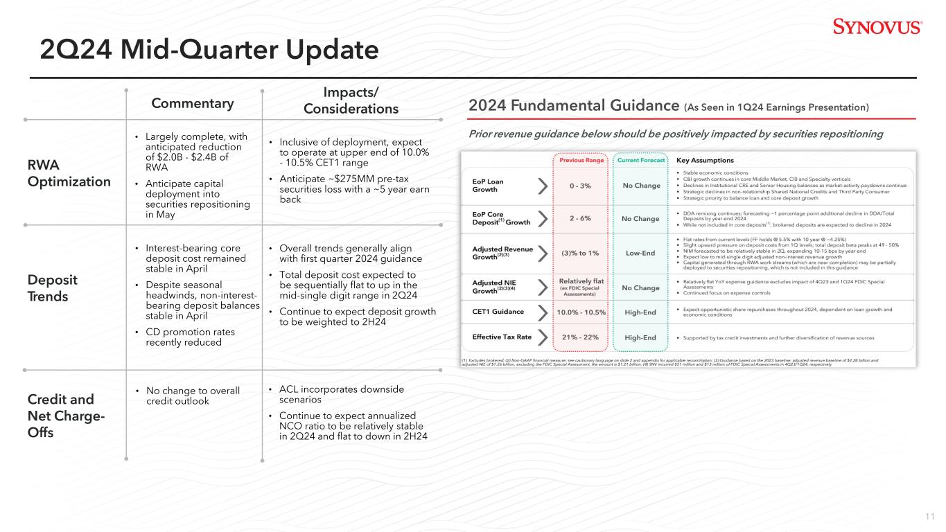 10 Enhanced Safety and Soundness Capital Credit Liquidity CET1 Ratio +75 bps since 12/31/22 Highest Tier 1 Ratio in Over a Decade Reduced CRE % Loans Exposure SNV Versus Proxy Peers 4Q23 ACL vs Day 1 CECL ACL bps Change(1)(2) 2023 Borrowings/Assets Improvement(3) Significantly Increased Liquidity Sources Amounts may not total due to rounding; (1) Source: SNV company reports and S&P Global; (2) Proxy peers are: BOKF, BKU, CADE, CMA, CFR, FHN, FNB, HWC, NYCB, PNFP, BPOP, RF, SSB, WBS, WAL, ZION; (3) Includes Fed Funds purchased and securities sold under repo, other short-term borrowings and long-term debt Primary: Dec. 31, 2022 March 31, 2024 $10.8B $14.7B Secondary: $7.1B $17.9B Total: $12.2B $26.9B Primary: Secondary: Total: 10.5% 10.9% 10.4% 10.1% 10.4% 10.6% 10.2% 11.0% 10.7% 10.7% 11.3% 11.5%