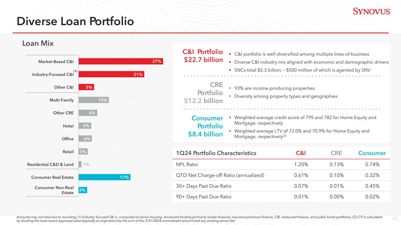 11 2Q24 Mid-Quarter Update RWA Optimization Deposit Trends • Largely complete, with anticipated reduction of $2.0B - $2.4B of RWA • Anticipate capital deployment into securities repositioning in May • ACL incorporates downside scenarios • Continue to expect annualized NCO ratio to be relatively stable in 2Q24 and flat to down in 2H24 2024 Fundamental Guidance (As Seen in 1Q24 Earnings Presentation) Prior revenue guidance below should be positively impacted by securities repositioning Commentary Impacts/ Considerations Credit and Net Charge- Offs • Inclusive of deployment, expect to operate at upper end of 10.0% - 10.5% CET1 range • Anticipate ~$275MM pre-tax securities loss with a ~5 year earn back • Overall trends generally align with first quarter 2024 guidance • Total deposit cost expected to be sequentially flat to up in the mid-single digit range in 2Q24 • Continue to expect deposit growth to be weighted to 2H24 • No change to overall credit outlook • Interest-bearing core deposit cost remained stable in April • Despite seasonal headwinds, non-interest- bearing deposit balances stable in April • CD promotion rates recently reduced