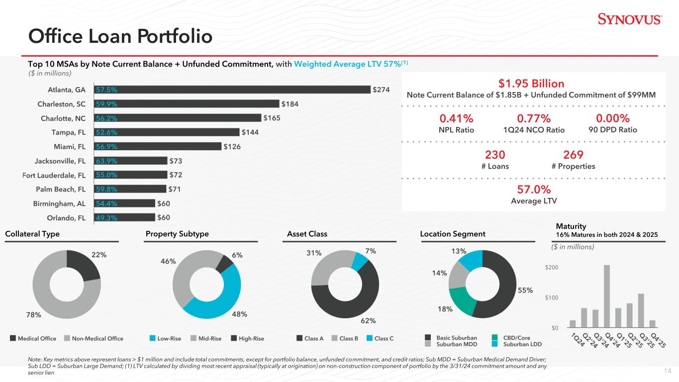 13 • 93% are income-producing properties • Diversity among property types and geographies • C&I portfolio is well-diversified among multiple lines-of-business • Diverse C&I industry mix aligned with economic and demographic drivers • SNCs total $5.3 billion, ~$500 million of which is agented by SNV • Weighted average credit score of 795 and 782 for Home Equity and Mortgage, respectively • Weighted average LTV of 73.0% and 70.9% for Home Equity and Mortgage, respectively(2) Consumer Portfolio $8.4 billion CRE Portfolio $12.2 billion C&I Portfolio $22.7 billion 1Q24 Portfolio Characteristics C&I CRE Consumer NPL Ratio 1.20% 0.13% 0.74% QTD Net Charge-off Ratio (annualized) 0.61% 0.10% 0.32% 30+ Days Past Due Ratio 0.07% 0.01% 0.45% 90+ Days Past Due Ratio 0.01% 0.00% 0.02% Amounts may not total due to rounding; (1) Industry-focused C&I is comprised of senior housing, structured lending (primarily lender finance), insurance premium finance, CIB, restaurant finance, and public funds portfolios; (2) LTV is calculated by dividing the most recent appraisal value (typically at origination) by the sum of the 3/31/2024 commitment amount and any existing senior lien Diverse Loan Portfolio Loan Mix (1)