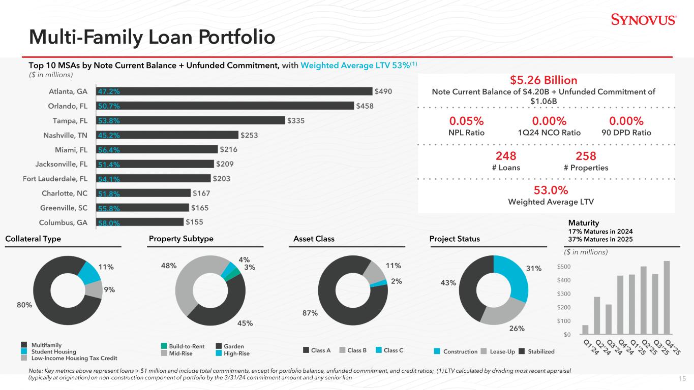 14 Collateral Type Property Subtype Asset Class Location Segment Top 10 MSAs by Note Current Balance + Unfunded Commitment, with Weighted Average LTV 57%(1) $1.95 Billion Note Current Balance of $1.85B + Unfunded Commitment of $99MM 0.41% NPL Ratio 0.77% 1Q24 NCO Ratio 57.0% Average LTV 0.00% 90 DPD Ratio Office Loan Portfolio 230 # Loans 269 # Properties Note: Key metrics above represent loans > $1 million and include total commitments, except for portfolio balance, unfunded commitment, and credit ratios; Sub MDD = Suburban Medical Demand Driver; Sub LDD = Suburban Large Demand; (1) LTV calculated by dividing most recent appraisal (typically at origination) on non-construction component of portfolio by the 3/31/24 commitment amount and any senior lien ($ in millions) ($ in millions) Maturity 16% Matures in both 2024 & 2025