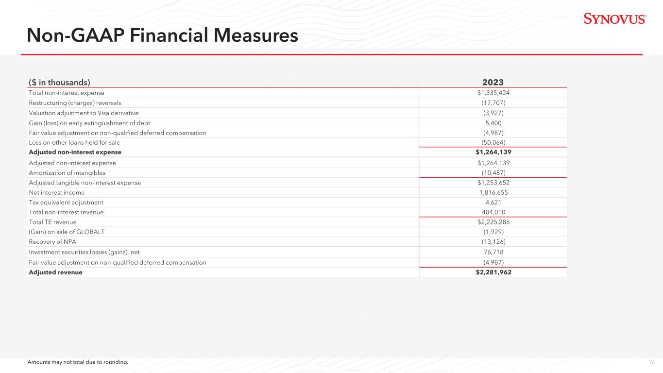 17 ($ in thousands) 2023 2022 2021 2020 Total non-interest expense $1,335,424 $1,157,506 $1,099,904 $1,179,574 Restructuring (charges) reversals (17,707) 9,690 (7,223) (26,991) Valuation adjustment to Visa derivative (3,927) (6,000) (2,656) (890) Gain (loss) on early extinguishment of debt 5,400 (677) — (10,466) Fair value adjustment on non-qualified deferred compensation (4,987) 4,054 (2,816) (2,310) Loss on other loans held for sale (50,064) — — — Merger-related expense — — — — Goodwill impairment — — — (44,877) Earnout liability adjustments — — (507) (4,908) Adjusted non-interest expense $1,264,139 $1,164,573 $1,086,702 $1,089,132 Amounts may not total due to rounding. Non-GAAP Financial Measures, Continued
