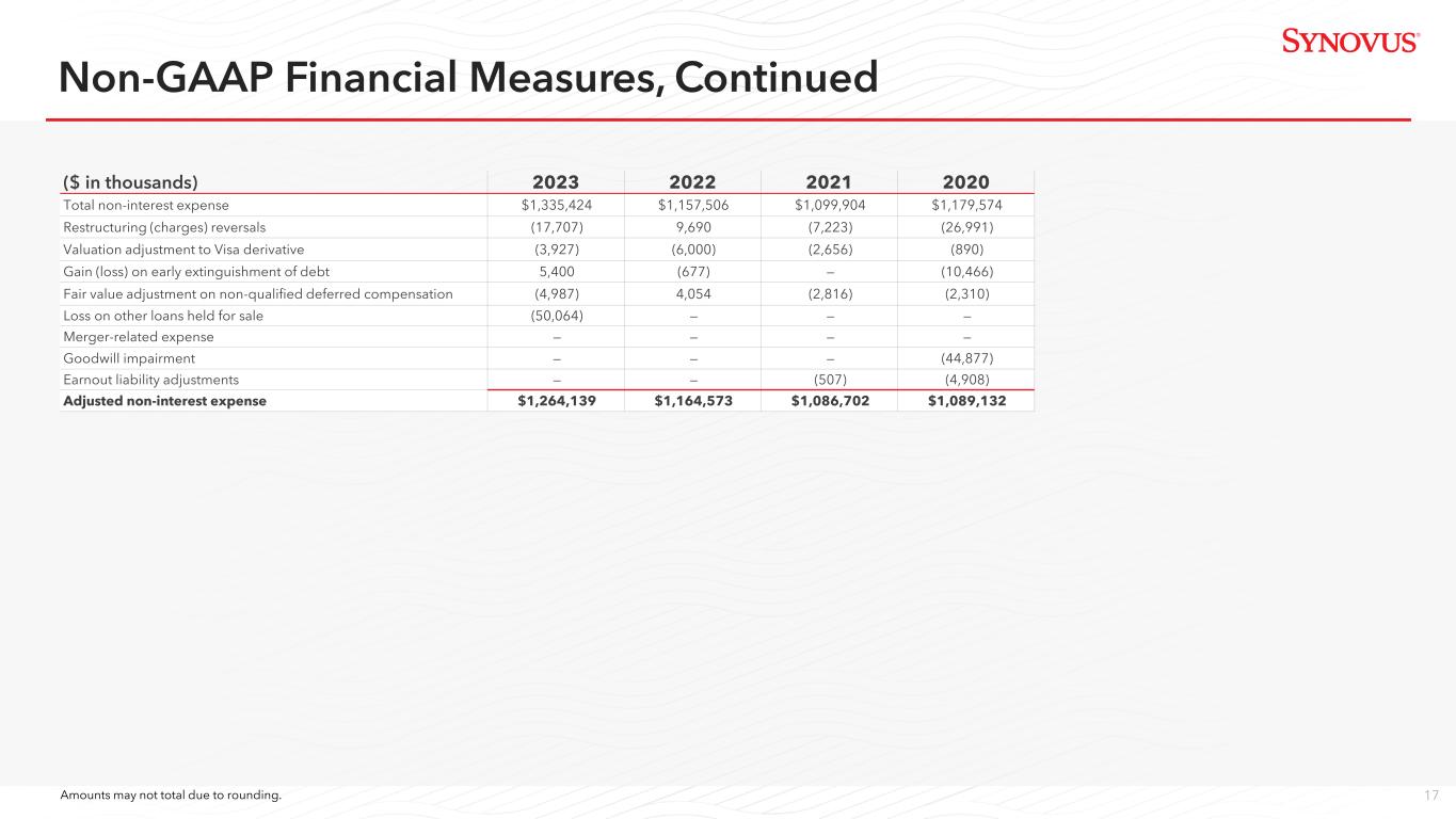 16 ($ in thousands) 2023 Total non-interest expense $1,335,424 Restructuring (charges) reversals (17,707) Valuation adjustment to Visa derivative (3,927) Gain (loss) on early extinguishment of debt 5,400 Fair value adjustment on non-qualified deferred compensation (4,987) Loss on other loans held for sale (50,064) Adjusted non-interest expense $1,264,139 Adjusted non-interest expense $1,264,139 Amortization of intangibles (10,487) Adjusted tangible non-interest expense $1,253,652 Net interest income 1,816,655 Tax equivalent adjustment 4,621 Total non-interest revenue 404,010 Total TE revenue $2,225,286 (Gain) on sale of GLOBALT (1,929) Recovery of NPA (13,126) Investment securities losses (gains), net 76,718 Fair value adjustment on non-qualified deferred compensation (4,987) Adjusted revenue $2,281,962 Amounts may not total due to rounding. Non-GAAP Financial Measures