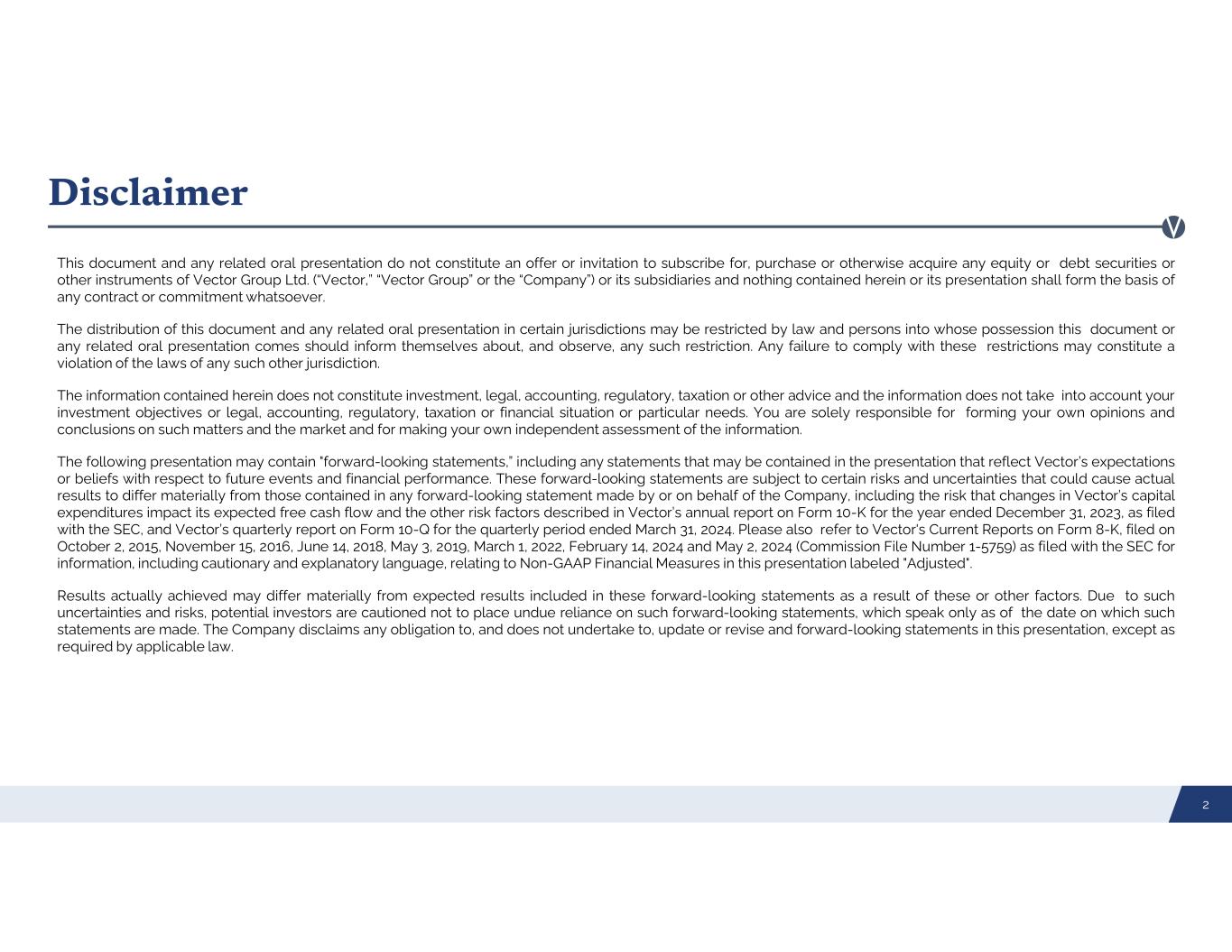 Disclaimer This document and any related oral presentation do not constitute an offer or invitation to subscribe for, purchase or otherwise acquire any equity or debt securities or other instruments of Vector Group Ltd. (“Vector,” “Vector Group” or the “Company”) or its subsidiaries and nothing contained herein or its presentation shall form the basis of any contract or commitment whatsoever. The distribution of this document and any related oral presentation in certain jurisdictions may be restricted by law and persons into whose possession this document or any related oral presentation comes should inform themselves about, and observe, any such restriction. Any failure to comply with these restrictions may constitute a violation of the laws of any such other jurisdiction. The information contained herein does not constitute investment, legal, accounting, regulatory, taxation or other advice and the information does not take into account your investment objectives or legal, accounting, regulatory, taxation or financial situation or particular needs. You are solely responsible for forming your own opinions and conclusions on such matters and the market and for making your own independent assessment of the information. The following presentation may contain "forward-looking statements,” including any statements that may be contained in the presentation that reflect Vector’s expectations or beliefs with respect to future events and financial performance. These forward-looking statements are subject to certain risks and uncertainties that could cause actual results to differ materially from those contained in any forward-looking statement made by or on behalf of the Company, including the risk that changes in Vector’s capital expenditures impact its expected free cash flow and the other risk factors described in Vector’s annual report on Form 10-K for the year ended December 31, 2023, as filed with the SEC, and Vector’s quarterly report on Form 10-Q for the quarterly period ended March 31, 2024. Please also refer to Vector's Current Reports on Form 8-K, filed on October 2, 2015, November 15, 2016, June 14, 2018, May 3, 2019, March 1, 2022, February 14, 2024 and May 2, 2024 (Commission File Number 1-5759) as filed with the SEC for information, including cautionary and explanatory language, relating to Non-GAAP Financial Measures in this presentation labeled "Adjusted". Results actually achieved may differ materially from expected results included in these forward-looking statements as a result of these or other factors. Due to such uncertainties and risks, potential investors are cautioned not to place undue reliance on such forward-looking statements, which speak only as of the date on which such statements are made. The Company disclaims any obligation to, and does not undertake to, update or revise and forward-looking statements in this presentation, except as required by applicable law. 2
