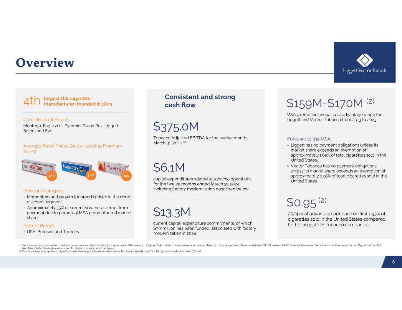 History Source: MSA CRA wholesale shipment database. Note: The Liggett and Vector Tobacco businesses have been combined into a single segment for all periods since 2007. 1) Vector’s operating income from the tobacco segment was $319.5, $360.3, $347.0 and $346.7 for the years ended December 31, 2020, 2021, 2022 and 2023, respectively, and $351.1 for the twelve months ended March 31, 2024 . Tobacco Adjusted EBITDA is a Non-GAAP Financial Measure and is defined in Table 2 and Table 5 of Exhibit 99.1 to the Company’s Current Reports on Form 8-K, filed on March 1, 2022 and May 2, 2024. Please also refer to Table 2 of Exhibit 99.2 to the Company’s Current Reports on Form 8-K, filed October 2, 2015, November 15, 2016, and Table 5 of Exhibit 99.1 to the Company's Current Report on Form 8-K, filed February 28, 2020. 7 T o b ac co A d ju st e d EB IT D A (1 ) ($ M ill io n s) D o m e stic M arke t S h are MSA, which was signed in November 1998, became effective and Liggett, as a Subsequent Participating Manufacturer, established perpetual cost advantage over three largest U.S. tobacco companies. Liggett also introduced deep discount brand Liggett Select taking advantage of the Company’s cost advantage resulting from the MSA 1999 Relaunched deep discount brand Grand Prix 2005 Repositioned Pyramid as a deep-discount brand in response to a large Federal Excise Tax increase 2009 Repositioned Eagle 20’s as a national deep discount brand 2013 Expansion of Deep Discount brand Montego to all markets 2020-2021 Montego becomes the largest U.S. discount brand 2023 $ 79 $ 77 $ 12 1 $ 11 1 $ 12 7 $ 13 0 $ 14 4 $ 14 6 $ 15 8 $ 17 0 $ 16 5 $ 15 8 $ 17 4 $ 18 6 $ 19 8 $ 20 9 $ 24 3 $ 26 8 $ 25 3 $ 24 9 $ 27 0 $ 32 8 $ 36 4 $ 35 1 $ 37 1 $ 37 5 1.2% 1.5% 2.2% 2.4% 2.5% 2.3% 2.2% 2.4% 2.5% 2.5% 2.7% 3.5% 3.8% 3.5% 3.3% 3.4% 3.3% 3.3% 3.7% 4.0%4.0% 4.1% 4.1% 5.4% 5.5% 5.6% -1% 0% 1% 2% 3% 4% 5% 6%