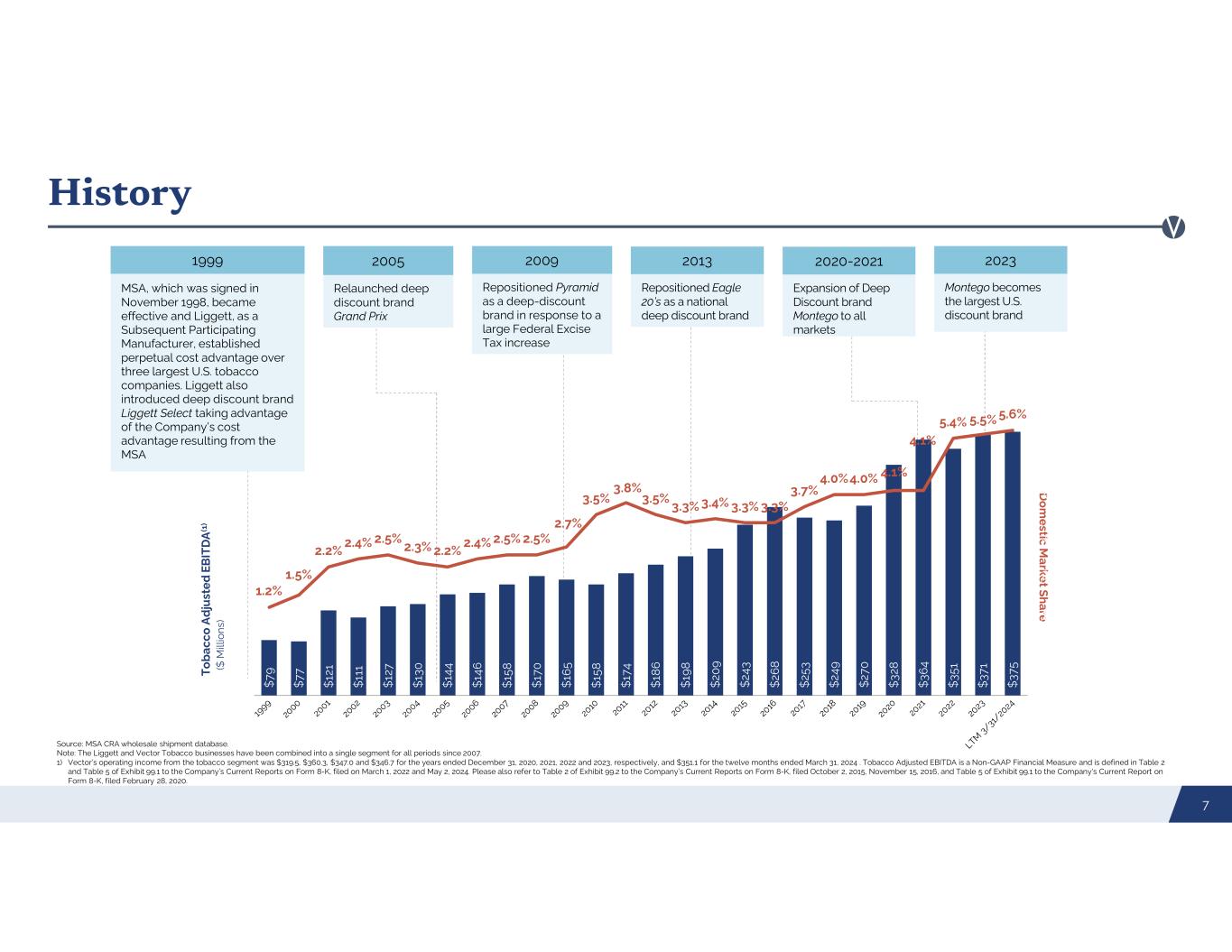 Consistent and strong cash flow Overview 6 4th largest U.S. cigarette manufacturer; founded in 1873 Core Discount Brands Montego, Eagle 20’s, Pyramid, Grand Prix, Liggett Select and Eve Average Retail Prices Below Leading Premium Brand 30% 10%50% Discount Category Momentum and growth for brands priced in the deep discount segment Approximately 35% of current volumes exempt from payment due to perpetual MSA grandfathered market share Partner Brands USA, Bronson and Tourney $375.0M Tobacco Adjusted EBITDA for the twelve months March 31, 2024 (1) $6.1M capital expenditures related to tobacco operations for the twelve months ended March 31, 2024, including factory modernization described below $13.3M current capital expenditure commitments, of which $9.7 million has been funded, associated with factory modernization in 2024. $0.95 (2) 2024 cost advantage per pack on first 1.93% of cigarettes sold in the United States compared to the largest U.S. tobacco companies Pursuant to the MSA Liggett has no payment obligations unless its market share exceeds an exemption of approximately 1.65% of total cigarettes sold in the United States, Vector Tobacco has no payment obligations unless its market share exceeds an exemption of approximately 0.28% of total cigarettes sold in the United States 1) Vector's operating income from the tobacco segment was $346.7 million for the year ended December 31, 2023 and $351.1 million for the twelve months ended March 31, 2024, respectively. Tobacco Adjusted EBITDA is a Non-GAAP Financial Measure and is defined in the Company’s Current Report on Form 8-K, filed May 2, 2024. Please also refer to the Disclaimer to this document on Page 2. 2) Cost advantage only applies to cigarettes sold below applicable market share exemption (approximately 1.93% of total cigarettes sold in the United States). $159M-$170M (2) MSA exemption annual cost advantage range for Liggett and Vector Tobacco from 2013 to 2023