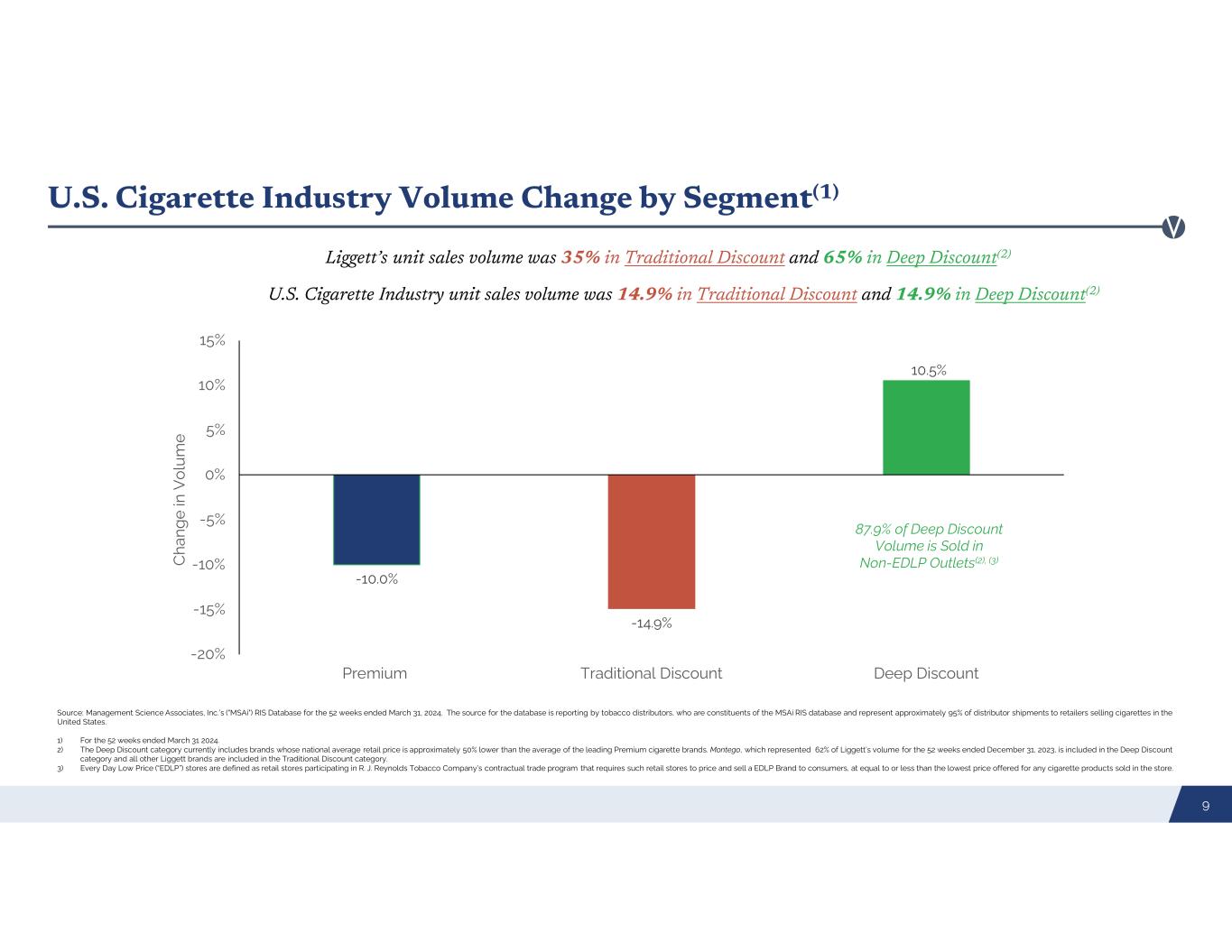 Adjusted U.S. Tobacco Industry Market Share(1), (2) Source: The Maxwell Report’s sales estimates for the cigarette Industry for the years ended 2003 (February 2004), 2006 (February 2007) and 2014 (March 2015) and internal estimates for 2023. 1) Actual Market Share in 2003, 2006 and 2014 reported in the Maxwell Report for Reynolds American was 29.6%, 27.6% and 23.1%, respectively, and, for ITG Brands, was 2.9%, 3.7%. and 2.7%, respectively. Adjusted market share has been computed by Vector Group Ltd. by applying historical market share of each brand to the present owner of such brand. Thus, the graph assumes each company owned its current brands on January 1, 2003. The legacy brands market share of Reynolds American in 2003 includes the market share of Brown & Williamson, which was acquired by Reynolds American in 2004. In 2015, Reynolds American acquired Lorillard Tobacco Company, which manufactured the Prominent Premium brand, and sold a portfolio of brands. 2) Does not include smaller manufacturers, whose cumulative market shares were 9.8%, 7.9%, 8.9% and 11.7% in 2003, 2006, 2014 and 2023, respectively. 8 46.7% 48.8% 47.4% 43.2% 20.9% 19.2% 18.4% 13.9% 2.9% 3.7% 2.7% 3.8% 2.4% 2.4% 3.4% 5.5% 0.3% 0.4% 1.5% 3.1% 7.7% 8.8% 12.4% 11.9% 9.3% 8.8% 6.7% 6.7% 2003 2006 2014 LTM 3/31/2024 2003 2006 2014 LTM 3/31/2024 2003 2006 2014 LTM 3/31/2024 2003 2006 2014 LTM 3/31/2024 28.9% 28.4% 32.4% 28.9% Philip Morris USA Reynolds American Liggett 2.89% 3.65% 2.71% 3.83% 2.44% 2.36% 3.36% 5.49% 9.26% 8.81% 6.74% 6.66% 2003 2006 2014 LTM 3/31/24 2003 2006 2014 LTM 3/31/24 12.15% 12.47% 9.45% 10.49% 12.2% 12.5% 9.5% 10.5% Newport – Prominent Premium brand acquired by RAI in 2015 Brands acquired by ITG in 2015 Legacy brands Santa Fe tobacco – acquired by RAI in 2002 ITG Brands