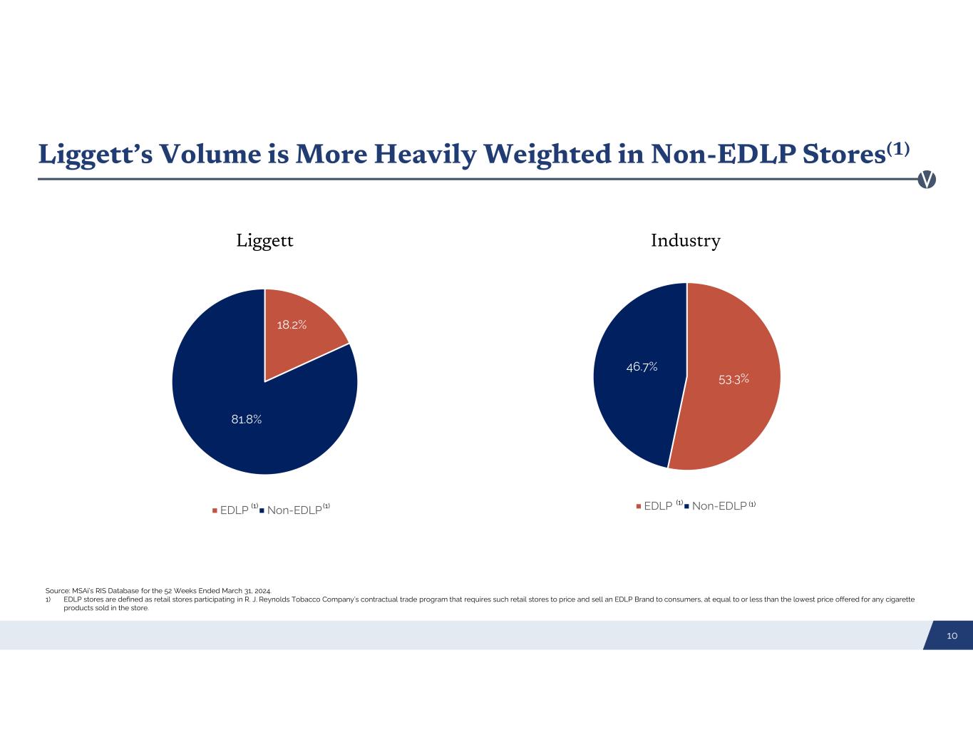 U.S. Cigarette Industry Volume Change by Segment(1) 9 -10.0% -14.9% 10.5% -20% -15% -10% -5% 0% 5% 10% 15% Premium Traditional Discount Deep Discount C ha ng e in V o lu m e 87.9% of Deep Discount Volume is Sold in Non-EDLP Outlets(2), (3) Source: Management Science Associates, Inc.’s ("MSAi") RIS Database for the 52 weeks ended March 31, 2024. The source for the database is reporting by tobacco distributors, who are constituents of the MSAi RIS database and represent approximately 95% of distributor shipments to retailers selling cigarettes in the United States. 1) For the 52 weeks ended March 31 2024. 2) The Deep Discount category currently includes brands whose national average retail price is approximately 50% lower than the average of the leading Premium cigarette brands. Montego, which represented 62% of Liggett’s volume for the 52 weeks ended December 31, 2023, is included in the Deep Discount category and all other Liggett brands are included in the Traditional Discount category. 3) Every Day Low Price (“EDLP”) stores are defined as retail stores participating in R. J. Reynolds Tobacco Company’s contractual trade program that requires such retail stores to price and sell a EDLP Brand to consumers, at equal to or less than the lowest price offered for any cigarette products sold in the store. Liggett’s unit sales volume was 35% in Traditional Discount and 65% in Deep Discount(2) U.S. Cigarette Industry unit sales volume was 14.9% in Traditional Discount and 14.9% in Deep Discount(2)