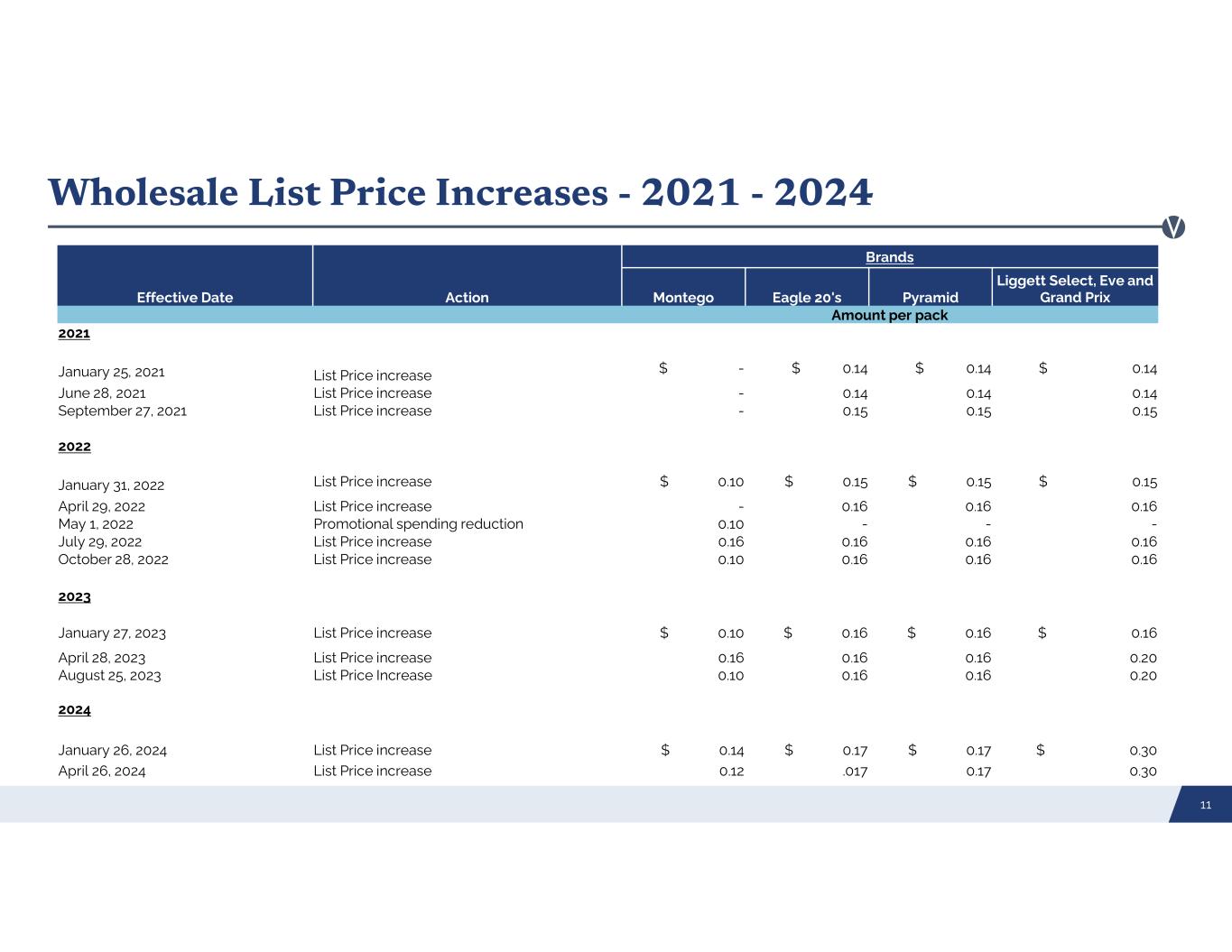 Wholesale List Price Increases - 2021 - 2024 11 Brands Liggett Select, Eve and Grand PrixPyramidEagle 20'sMontegoActionEffective Date Amount per pack 2021 $ 0.14$ 0.14$ 0.14$ -List Price increaseJanuary 25, 2021 0.140.140.14-List Price increaseJune 28, 2021 0.150.150.15-List Price increaseSeptember 27, 2021 2022 $ 0.15$ 0.15$ 0.15$ 0.10List Price increaseJanuary 31, 2022 0.160.160.16-List Price increaseApril 29, 2022 ---0.10Promotional spending reductionMay 1, 2022 0.160.160.160.16List Price increaseJuly 29, 2022 0.160.160.160.10List Price increase October 28, 2022 2023 $ 0.16$ 0.16$ 0.16$ 0.10List Price increaseJanuary 27, 2023 0.200.160.160.16List Price increaseApril 28, 2023 0.200.160.160.10List Price IncreaseAugust 25, 2023 2024 $ 0.30$ 0.17$ 0.17$ 0.14List Price increaseJanuary 26, 2024 0.300.17.0170.12List Price increaseApril 26, 2024