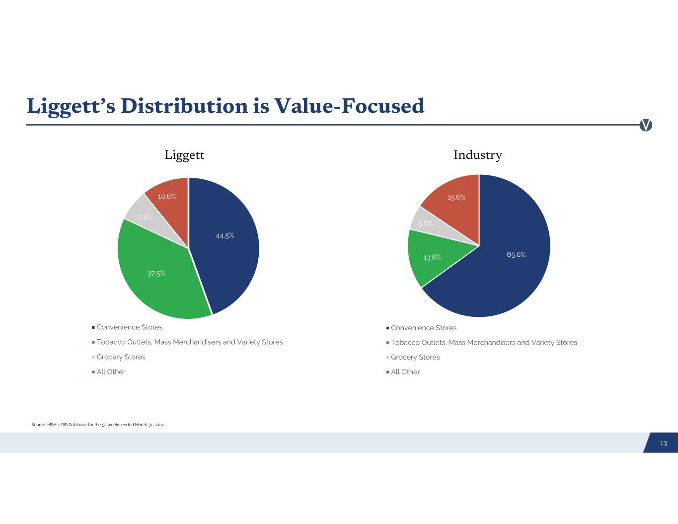 Average per Pack Price (Retail)–EDLP Stores(1) and Non-EDLP(1), (2) Stores 12 $7.70 $5.52 $8.07 $6.96 N/A $8.36 $6.68 $8.10 $6.71 $4.93 $0.00 $1.00 $2.00 $3.00 $4.00 $5.00 $6.00 $7.00 $8.00 $9.00 Largest Premium Brand Second Largest Discount Brand Prominent Discount Brand Relaunched In 2021 Pyramid Eagle 20's Montego (Largest Discount Brand) A ve ra g e P ac k P ric e EDLP Non-EDLP (1), (2) (1), (2) Source: Company estimates in Liggett's markets for the 13 weeks ended March 31, 2024. 1) EDLP stores are defined as retail stores participating in R. J. Reynolds Tobacco Company’s contractual trade program that requires such retail stores to price and sell an EDLP Brand to consumers, at equal to or less than the lowest price offered for any cigarette products sold in the store. 2) Company retail pricing estimates include State Excise Tax and, as such, average brand pricing estimates maybe impacted by the degree of geographic diversity in the retail store population sample.