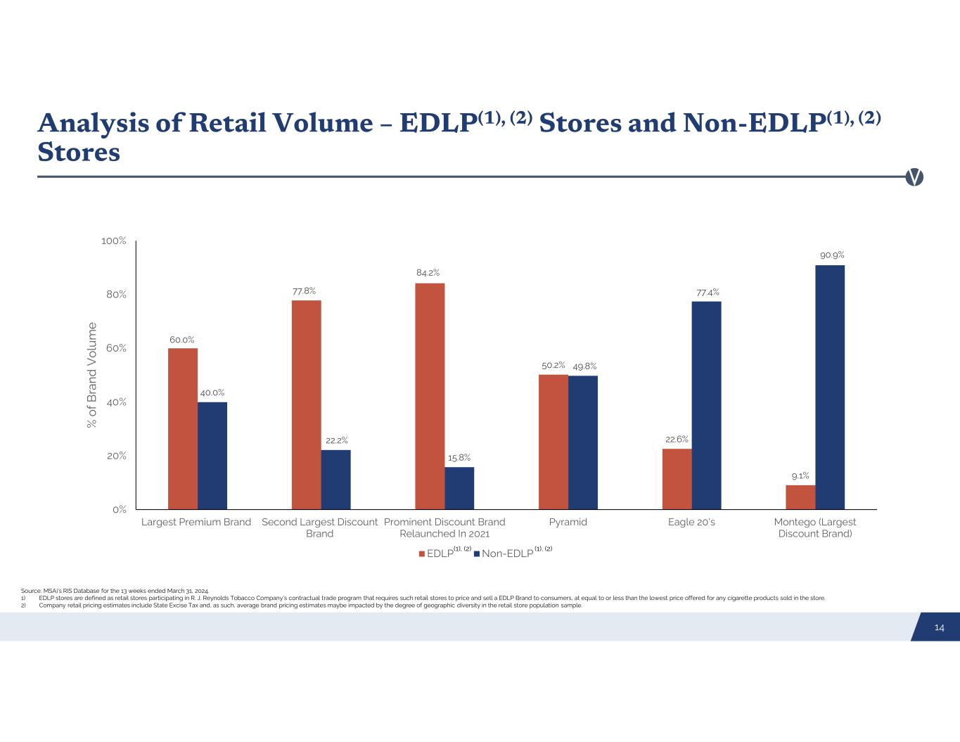Liggett’s Distribution is Value-Focused 13 44.5% 37.5% 7.2% 10.8% Convenience Stores Tobacco Outlets, Mass Merchandisers and Variety Stores Grocery Stores All Other 65.0%13.8% 5.6% 15.6% Convenience Stores Tobacco Outlets, Mass Merchandisers and Variety Stores Grocery Stores All Other Liggett Industry Source: MSAi’s RIS Database for the 52 weeks ended March 31, 2024.