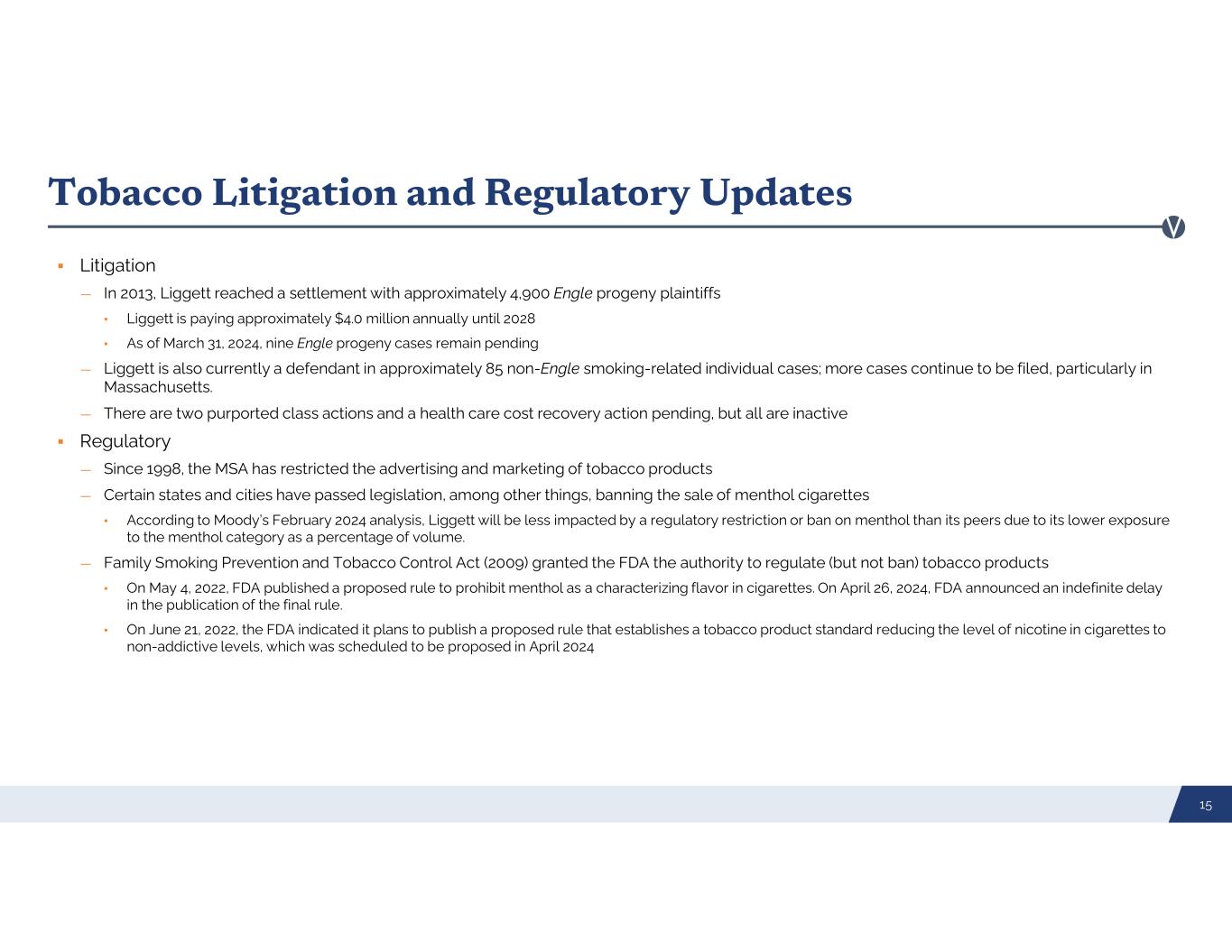 Tobacco Litigation and Regulatory Updates Litigation — In 2013, Liggett reached a settlement with approximately 4,900 Engle progeny plaintiffs • Liggett is paying approximately $4.0 million annually until 2028 • As of March 31, 2024, nine Engle progeny cases remain pending — Liggett is also currently a defendant in approximately 85 non-Engle smoking-related individual cases; more cases continue to be filed, particularly in Massachusetts. — There are two purported class actions and a health care cost recovery action pending, but all are inactive Regulatory — Since 1998, the MSA has restricted the advertising and marketing of tobacco products — Certain states and cities have passed legislation, among other things, banning the sale of menthol cigarettes • According to Moody’s February 2024 analysis, Liggett will be less impacted by a regulatory restriction or ban on menthol than its peers due to its lower exposure to the menthol category as a percentage of volume. — Family Smoking Prevention and Tobacco Control Act (2009) granted the FDA the authority to regulate (but not ban) tobacco products • On May 4, 2022, FDA published a proposed rule to prohibit menthol as a characterizing flavor in cigarettes. On April 26, 2024, FDA announced an indefinite delay in the publication of the final rule. • On June 21, 2022, the FDA indicated it plans to publish a proposed rule that establishes a tobacco product standard reducing the level of nicotine in cigarettes to non-addictive levels, which was scheduled to be proposed in April 2024 15