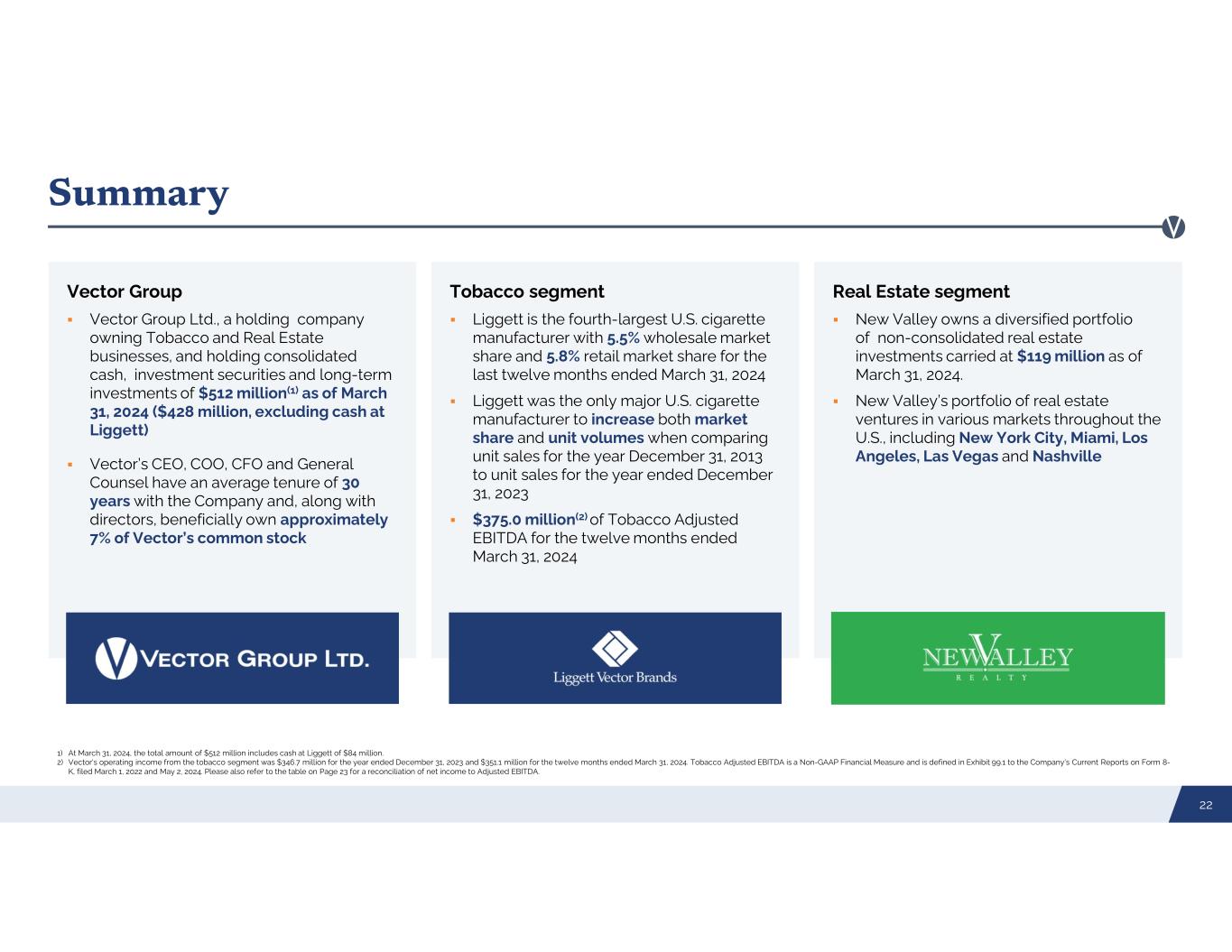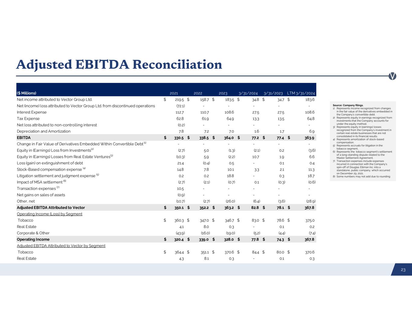 Adjusted EBITDA Reconciliation Source: Company filings. 1) Represents income recognized from changes in the fair value of the derivatives embedded in the Company’s convertible debt. 2) Represents equity in earnings recognized from investments that the Company accounts for under the equity method. 3) Represents equity in (earnings) losses recognized from the Company’s investment in certain real estate businesses that are not consolidated in its financial results. 4) Represents amortization of stock-based compensation. 5) Represents accruals for litigation in the tobacco segment.. 6) Represents the tobacco segment's settlement of a long-standing dispute related to the Master Settlement Agreement. 7) Transaction expenses include expenses incurred in connection with the Company’s spin-off of Douglas Elliman Inc. into a standalone, public company, which occurred on December 29, 2021. 8) Some numbers may not add due to rounding 23 ($ Millions) ($ Millions) 2021 2022 2023 3/31/2024 3/31/2023 LTM 3/31/2024 Net income attributed to Vector Group Ltd. 219.5$ 158.7$ 183.5$ 34.8$ 34.7$ 183.6$ Net (income) loss attributed to Vector Group Ltd. from discontinued operations (72.1) - - - - - Interest Expense 112.7 110.7 108.6 27.5 27.5 108.6 Tax Expense 62.8 61.9 64.9 13.3 13.5 64.8 Net loss attributed to non-controlling interest (0.2) - - - - - Depreciation and Amortization 7.8 7.2 7.0 1.6 1.7 6.9 EBITDA 330.5$ 338.5$ 364.0$ 77.2$ 77.4$ 363.9$ Change in Fair Value of Derivatives Embedded Within Convertible Debt (1) - - - - - - Equity in (Earnings) Loss from Investments(2) (2.7) 5.0 (1.3) (2.1) 0.2 (3.6) Equity in (Earnings) Losses from Real Estate Ventures(3) (10.3) 5.9 (2.2) 10.7 1.9 6.6 Loss (gain) on extinguishment of debt 21.4 (0.4) 0.5 - 0.1 0.4 Stock-Based compensation expense (4) 14.8 7.8 10.1 3.3 2.1 11.3 Litigation settlement and judgment expense (5) 0.2 0.2 18.8 - 0.3 18.7 Impact of MSA settlement (6) (2.7) (2.1) (0.7) 0.1 (0.3) (0.6) Transaction expenses (7) 10.5 - - - - - Net gains on sales of assets (0.9) - - - - - Other, net (10.7) (2.7) (26.0) (6.4) (3.6) (28.9) Adjusted EBITDA Attributed to Vector 350.1$ 352.2$ 363.2$ 82.8$ 78.1$ 367.8$ Operating Income (Loss) by Segment Tobacco 360.3$ 347.0$ 346.7$ 83.0$ 78.6$ 375.0$ Real Estate 4.1 8.0 0.3 - 0.1 0.2 Corporate & Other (43.9) (16.0) (19.0) (5.2) (4.4) (7.4) Operating Income 320.4$ 339.0$ 328.0$ 77.8$ 74.3$ 367.8$ Adjusted EBITDA Attributed to Vector by Segment Tobacco 364.4$ 351.1$ 370.6$ 84.4$ 80.0$ 370.6$ Real Estate 4.3 8.1 0.3 - 0.1 0.3