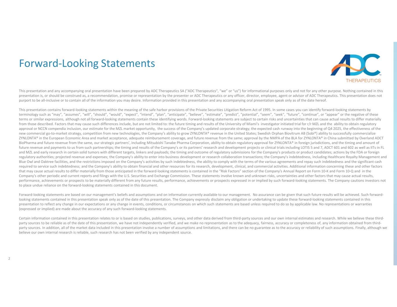 2 Forward-Looking Statements This presentation and any accompanying oral presentation have been prepared by ADC Therapeutics SA ("ADC Therapeutics“, “we” or “us”) for informational purposes only and not for any other purpose. Nothing contained in this presentation is, or should be construed as, a recommendation, promise or representation by the presenter or ADC Therapeutics or any officer, director, employee, agent or advisor of ADC Therapeutics. This presentation does not purport to be all-inclusive or to contain all of the information you may desire. Information provided in this presentation and any accompanying oral presentation speak only as of the date hereof. This presentation contains forward-looking statements within the meaning of the safe harbor provisions of the Private Securities Litigation Reform Act of 1995. In some cases you can identify forward-looking statements by terminology such as “may”, “assumes”, “will”, “should”, “would”, “expect”, “intend”, “plan”, “anticipate”, “believe”, “estimate”, “predict”, “potential”, “seem”, “seek”, “future”, “continue”, or “appear” or the negative of these terms or similar expressions, although not all forward-looking statements contain these identifying words. Forward-looking statements are subject to certain risks and uncertainties that can cause actual results to differ materially from those described. Factors that may cause such differences include, but are not limited to: the future timing and results of the University of Miami’s investigator initiated trial for r/r MZL and the ability to obtain regulatory approval or NCCN compendia inclusion, our estimate for the MZL market opportunity, the success of the Company’s updated corporate strategy; the expected cash runway into the beginning of Q4 2025, the effectiveness of the new commercial go-to-market strategy, competition from new technologies, the Company’s ability to grow ZYNLONTA® revenue in the United States; Swedish Orphan Biovitrum AB (Sobi®) ability to successfully commercialize ZYNLONTA® in the European Economic Area and market acceptance, adequate reimbursement coverage, and future revenue from the same; approval by the NMPA of the BLA for ZYNLONTA® in China submitted by Overland ADCT BioPharma and future revenue from the same, our strategic partners’, including Mitsubishi Tanabe Pharma Corporation, ability to obtain regulatory approval for ZYNLONTA® in foreign jurisdictions, and the timing and amount of future revenue and payments to us from such partnerships; the timing and results of the Company’s or its partners’ research and development projects or clinical trials including LOTIS 5 and 7, ADCT 601 and 602 as well as IITs in FL and MZL and early research in certain solid tumors with different targets, linkers and payloads; the timing and outcome of regulatory submissions for the Company’s products or product candidates; actions by the FDA or foreign regulatory authorities; projected revenue and expenses; the Company’s ability to enter into business development or research collaboration transactions; the Company’s indebtedness, including Healthcare Royalty Management and Blue Owl and Oaktree facilities, and the restrictions imposed on the Company’s activities by such indebtedness, the ability to comply with the terms of the various agreements and repay such indebtedness and the significant cash required to service such indebtedness; and the Company’s ability to obtain financial and other resources for its research, development, clinical, and commercial activities. Additional information concerning these and other factors that may cause actual results to differ materially from those anticipated in the forward-looking statements is contained in the “Risk Factors” section of the Company's Annual Report on Form 10-K and Form 10-Q and in the Company's other periodic and current reports and filings with the U.S. Securities and Exchange Commission. These statements involve known and unknown risks, uncertainties and other factors that may cause actual results, performance, achievements or prospects to be materially different from any future results, performance, achievements or prospects expressed in or implied by such forward-looking statements. The Company cautions investors not to place undue reliance on the forward-looking statements contained in this document. Forward-looking statements are based on our management’s beliefs and assumptions and on information currently available to our management. No assurance can be given that such future results will be achieved. Such forward- looking statements contained in this presentation speak only as of the date of this presentation. The Company expressly disclaim any obligation or undertaking to update these forward-looking statements contained in this presentation to reflect any change in our expectations or any change in events, conditions, or circumstances on which such statements are based unless required to do so by applicable law. No representations or warranties (expressed or implied) are made about the accuracy of any such forward-looking statements. Certain information contained in this presentation relates to or is based on studies, publications, surveys, and other data derived from third-party sources and our own internal estimates and research. While we believe these third- party sources to be reliable as of the date of this presentation, we have not independently verified, and we make no representation as to the adequacy, fairness, accuracy or completeness of, any information obtained from third- party sources. In addition, all of the market data included in this presentation involve a number of assumptions and limitations, and there can be no guarantee as to the accuracy or reliability of such assumptions. Finally, although we believe our own internal research is reliable, such research has not been verifi