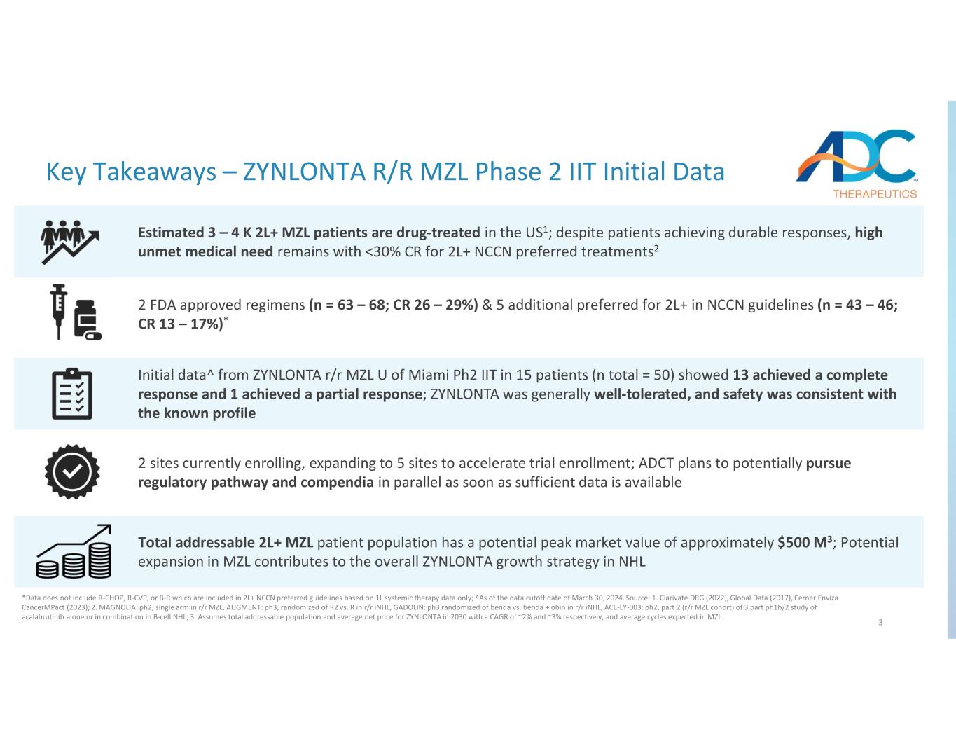 2 Forward-Looking Statements This presentation and any accompanying oral presentation have been prepared by ADC Therapeutics SA ("ADC Therapeutics“, “we” or “us”) for informational purposes only and not for any other purpose. Nothing contained in this presentation is, or should be construed as, a recommendation, promise or representation by the presenter or ADC Therapeutics or any officer, director, employee, agent or advisor of ADC Therapeutics. This presentation does not purport to be all-inclusive or to contain all of the information you may desire. Information provided in this presentation and any accompanying oral presentation speak only as of the date hereof. This presentation contains forward-looking statements within the meaning of the safe harbor provisions of the Private Securities Litigation Reform Act of 1995. In some cases you can identify forward-looking statements by terminology such as “may”, “assumes”, “will”, “should”, “would”, “expect”, “intend”, “plan”, “anticipate”, “believe”, “estimate”, “predict”, “potential”, “seem”, “seek”, “future”, “continue”, or “appear” or the negative of these terms or similar expressions, although not all forward-looking statements contain these identifying words. Forward-looking statements are subject to certain risks and uncertainties that can cause actual results to differ materially from those described. Factors that may cause such differences include, but are not limited to: the future timing and results of the University of Miami’s investigator initiated trial for r/r MZL and the ability to obtain regulatory approval or NCCN compendia inclusion, our estimate for the MZL market opportunity, the success of the Company’s updated corporate strategy; the expected cash runway into the beginning of Q4 2025, the effectiveness of the new commercial go-to-market strategy, competition from new technologies, the Company’s ability to grow ZYNLONTA® revenue in the United States; Swedish Orphan Biovitrum AB (Sobi®) ability to successfully commercialize ZYNLONTA® in the European Economic Area and market acceptance, adequate reimbursement coverage, and future revenue from the same; approval by the NMPA of the BLA for ZYNLONTA® in China submitted by Overland ADCT BioPharma and future revenue from the same, our strategic partners’, including Mitsubishi Tanabe Pharma Corporation, ability to obtain regulatory approval for ZYNLONTA® in foreign jurisdictions, and the timing and amount of future revenue and payments to us from such partnerships; the timing and results of the Company’s or its partners’ research and development projects or clinical trials including LOTIS 5 and 7, ADCT 601 and 602 as well as IITs in FL and MZL and early research in certain solid tumors with different targets, linkers and payloads; the timing and outcome of regulatory submissions for the Company’s products or product candidates; actions by the FDA or foreign regulatory authorities; projected revenue and expenses; the Company’s ability to enter into business development or research collaboration transactions; the Company’s indebtedness, including Healthcare Royalty Management and Blue Owl and Oaktree facilities, and the restrictions imposed on the Company’s activities by such indebtedness, the ability to comply with the terms of the various agreements and repay such indebtedness and the significant cash required to service such indebtedness; and the Company’s ability to obtain financial and other resources for its research, development, clinical, and commercial activities. Additional information concerning these and other factors that may cause actual results to differ materially from those anticipated in the forward-looking statements is contained in the “Risk Factors” section of the Company's Annual Report on Form 10-K and Form 10-Q and in the Company's other periodic and current reports and filings with the U.S. Securities and Exchange Commission. These statements involve known and unknown risks, uncertainties and other factors that may cause actual results, performance, achievements or prospects to be materially different from any future results, performance, achievements or prospects expressed in or implied by such forward-looking statements. The Company cautions investors not to place undue reliance on the forward-looking statements contained in this document. Forward-looking statements are based on our management’s beliefs and assumptions and on information currently available to our management. No assurance can be given that such future results will be achieved. Such forward- looking statements contained in this presentation speak only as of the date of this presentation. The Company expressly disclaim any obligation or undertaking to update these forward-looking statements contained in this presentation to reflect any change in our expectations or any change in events, conditions, or circumstances on which such statements are based unless required to do so by applicable law. No representations or warranties (expressed or implied) are made about the accuracy of any such forward-looking statements. Certain information contained in this presentation relates to or is based on studies, publications, surveys, and other data derived from third-party sources and our own internal estimates and research. While we believe these third- party sources to be reliable as of the date of this presentation, we have not independently verified, and we make no representation as to the adequacy, fairness, accuracy or completeness of, any information obtained from third- party sources. In addition, all of the market data included in this presentation involve a number of assumptions and limitations, and there can be no guarantee as to the accuracy or reliability of such assumptions. Finally, although we believe our own internal research is reliable, such research has not been verifi