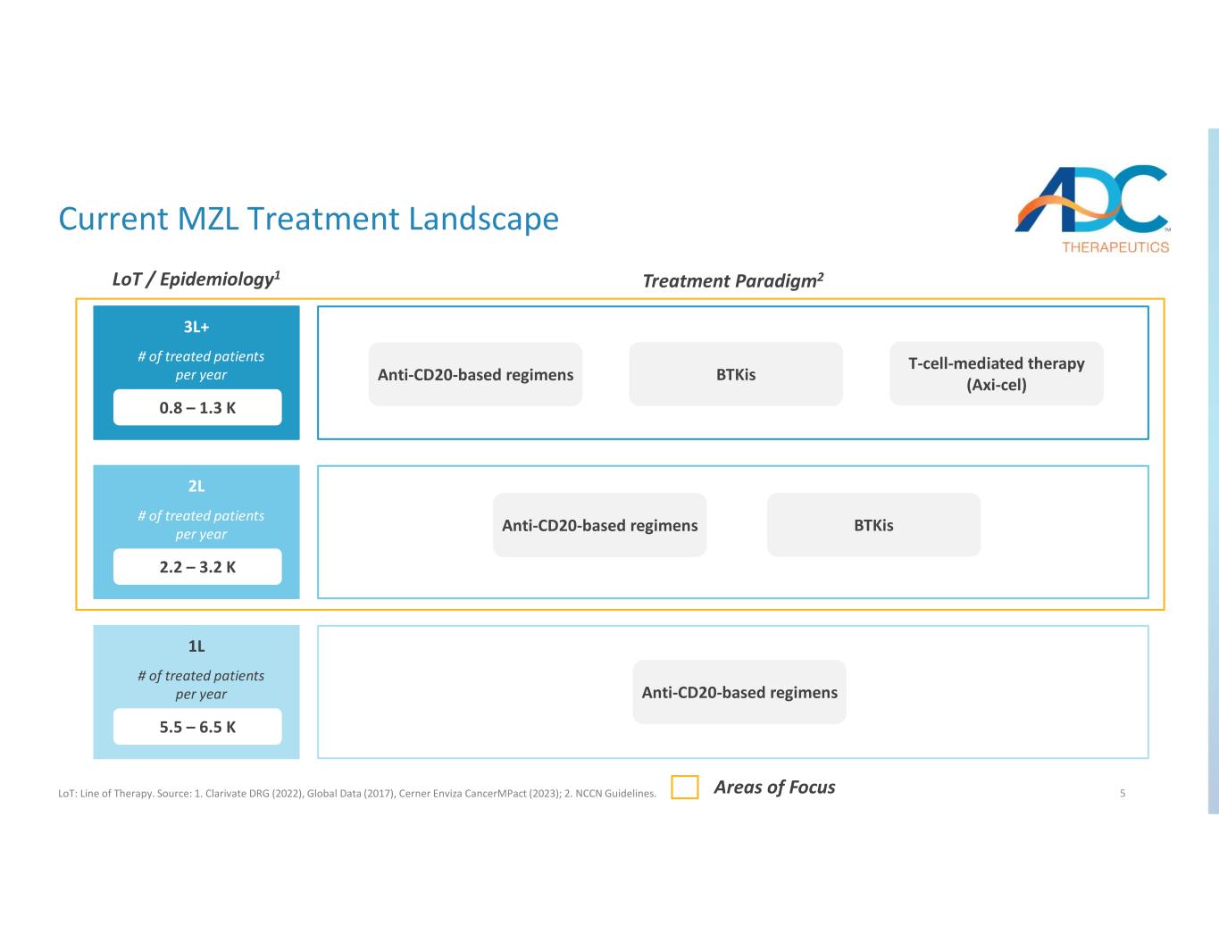4 Overview of MZL Market and ZYNLONTA Study Source: 1. Clarivate DRG (2022), Global Data (2017), Cerner Enviza CancerMPact (2023); 2.NCCN guidelines; 3. MAGNOLIA: ph2, single arm in r/r MZL, AUGMENT: ph3, randomized of R2 vs. R in r/r iNHL, GADOLIN: ph3 randomized of benda vs. benda + obin in r/r iNHL, ACE-LY-003: ph2, part 2 (r/r MZL cohort) of 3 part ph1b/2 study of acalabrutinib alone or in combination in B-cell NHL; 4. Alderuccio et al., J Clin Oncol (2018), Alderuccio et al., Am J Hematol (2019). MZL Treatment and Market Overview An estimated 3 – 4 K r/r MZL patients1 are treated with systemic anti-cancer regimens annually NCCN preferred agents include anti-CD20-based regimens across all lines in addition to BTKis in 2L+2 CR rates are modest for 2L+ FDA approved and NCCN preferred agents (i.e., <30%)3 Clinicians continue to seek novel agents with higher CR rates and fixed treatment duration Achievement of complete response to treatment represents the strongest predictor of positive outcomes in MZL4 The U of Miami IIT is a multi-institutional Phase 2 trial evaluating ZYNLONTA in 50 patients with r/r MZL ZYNLONTA is administered with a fixed duration of 6 cycles; patients will be treated for 18 weeks and followed for up to 3 years with PFS and OS measured at 24 months Based on modest CR rates from currently approved therapies, the futility threshold for ZYNLONTA in this patient population was determined to be a 31% CR rate Initial data of ZYNLONTA in 15 patients showed 13 achieved a complete response and 1 achieved a partial response All patients achieving responses are maintaining them as of the data cutoff on March 30 with the longest responder reaching approximately 20 months ZYNLONTA was generally well-tolerated, and safety was consistent with the known profile Trial Design & Initial Results