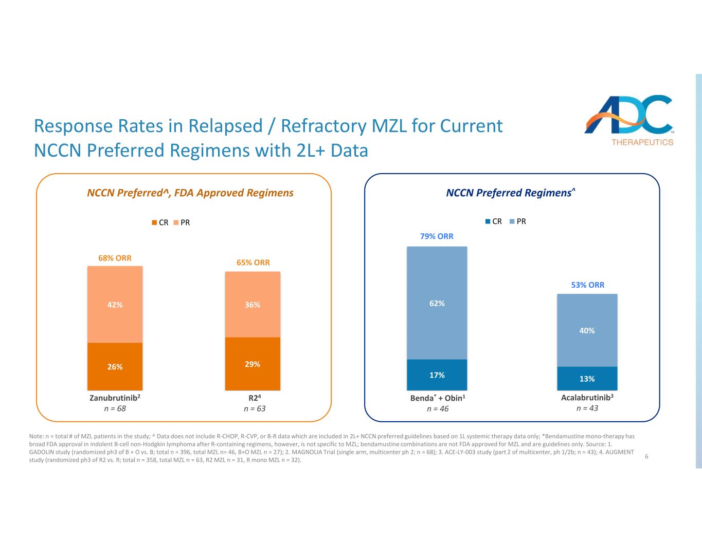 5 3L+ Current MZL Treatment Landscape LoT: Line of Therapy. Source: 1. Clarivate DRG (2022), Global Data (2017), Cerner Enviza CancerMPact (2023); 2. NCCN Guidelines. LoT / Epidemiology1 Treatment Paradigm2 Anti-CD20-based regimens BTKis Anti-CD20-based regimens T-cell-mediated therapy (Axi-cel)Anti-CD20-based regimens BTKis # of treated patients per year 0.8 – 1.3 K 2L # of treated patients per year 2.2 – 3.2 K 1L # of treated patients per year 5.5 – 6.5 K Areas of Focus