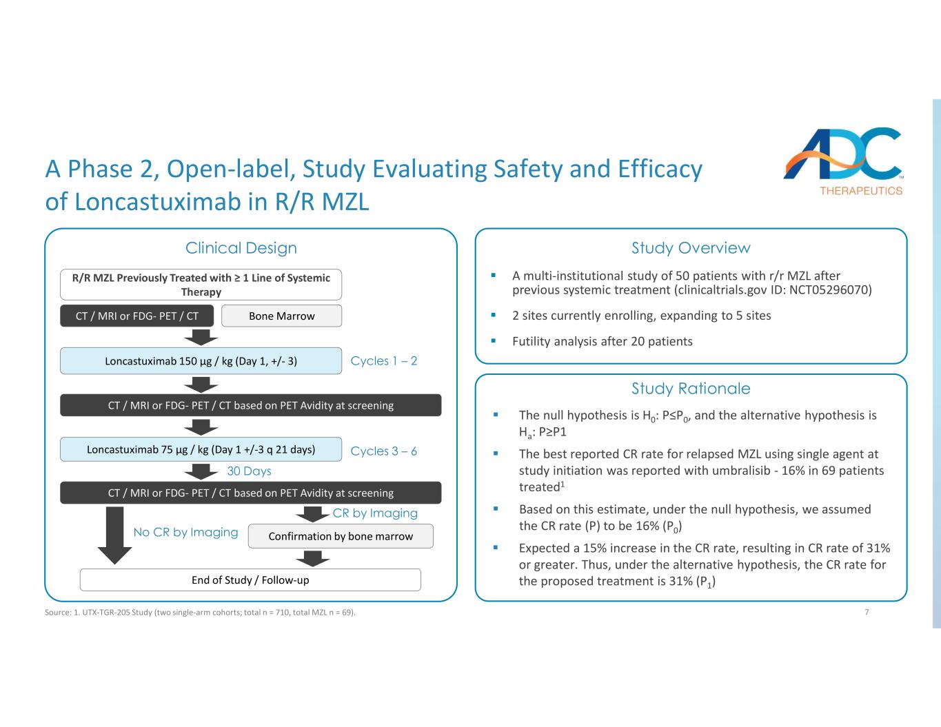 6 17% 13% 62% 40% Benda + Obin1* n=46 Acalabrutinib4 n=43 CR PR 26% 29% 42% 36% Zanubrutinib2 n=68 R25 n=63 CR PR NCCN Preferred^, FDA Approved Regimens NCCN Preferred Regimens^ 68% ORR 65% ORR 79% ORR 53% ORR Zanu r tinib2 n 68 24 n 63 Be * + Obin1 n 46 Acalabrutinib3 n 43 Response Rates in Relapsed / Refractory MZL for Current NCCN Preferred Regimens with 2L+ Data Note: n = total # of MZL patients in the study; ^ Data does not include R-CHOP, R-CVP, or B-R data which are included in 2L+ NCCN preferred guidelines based on 1L systemic therapy data only; *Bendamustine mono-therapy has broad FDA approval in indolent B-cell non-Hodgkin lymphoma after R-containing regimens, however, is not specific to MZL; bendamustine combinations are not FDA approved for MZL and are guidelines only. Source: 1. GADOLIN study (randomized ph3 of B + O vs. B; total n = 396, total MZL n= 46, B+O MZL n = 27); 2. MAGNOLIA Trial (single arm, multicenter ph 2; n = 68); 3. ACE-LY-003 study (part 2 of multicenter, ph 1/2b; n = 43); 4. AUGMENT study (randomized ph3 of R2 vs. R; total n = 358, total MZL n = 63, R2 MZL n = 31, R mono MZL n = 32).