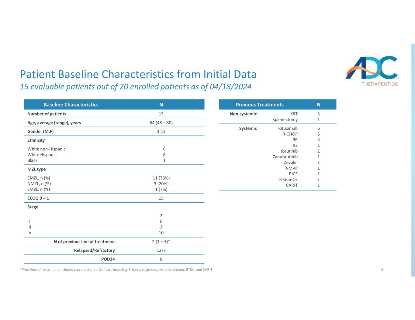 7 A Phase 2, Open-label, Study Evaluating Safety and Efficacy of Loncastuximab in R/R MZL Source: 1. UTX-TGR-205 Study (two single-arm cohorts; total n = 710, total MZL n = 69). Clinical Design R/R MZL Previously Treated with ≥ 1 Line of Systemic Therapy Loncastuximab 150 μg / kg (Day 1, +/- 3) CT / MRI or FDG- PET / CT based on PET Avidity at screening Loncastuximab 75 μg / kg (Day 1 +/-3 q 21 days) CT / MRI or FDG- PET / CT Bone Marrow CT / MRI or FDG- PET / CT based on PET Avidity at screening Cycles 1 – 2 Cycles 3 – 6 30 Days End of Study / Follow-up Confirmation by bone marrow CR by Imaging No CR by Imaging Study Overview The null hypothesis is H0: P≤P0, and the alternative hypothesis is Ha: P≥P1 The best reported CR rate for relapsed MZL using single agent at study initiation was reported with umbralisib - 16% in 69 patients treated1 Based on this estimate, under the null hypothesis, we assumed the CR rate (P) to be 16% (P0) Expected a 15% increase in the CR rate, resulting in CR rate of 31% or greater. Thus, under the alternative hypothesis, the CR rate for the proposed treatment is 31% (P1) A multi-institutional study of 50 patients with r/r MZL after previous systemic treatment (clinicaltrials.gov ID: NCT05296070) 2 sites currently enrolling, expanding to 5 sites Futility analysis after 20 patients Study Rationale