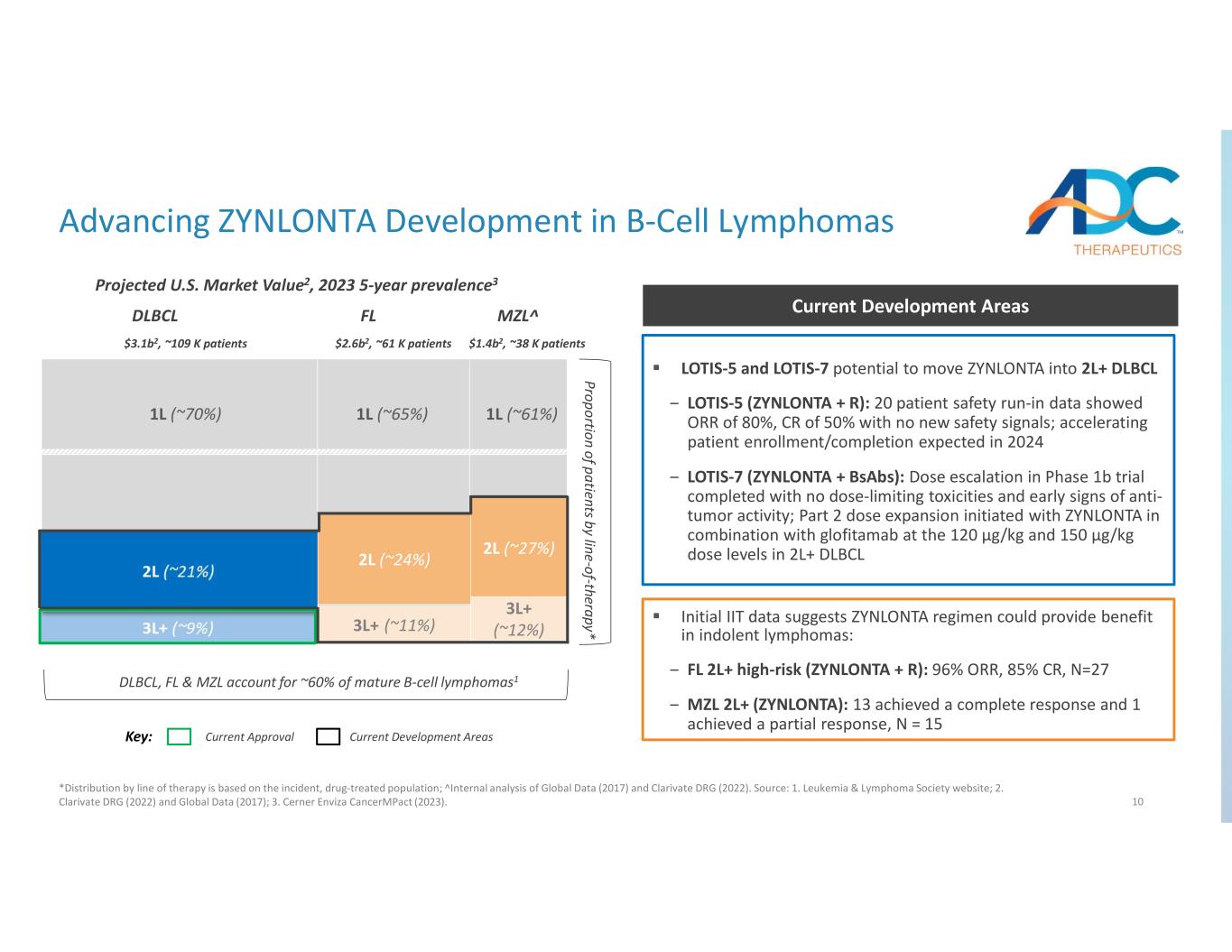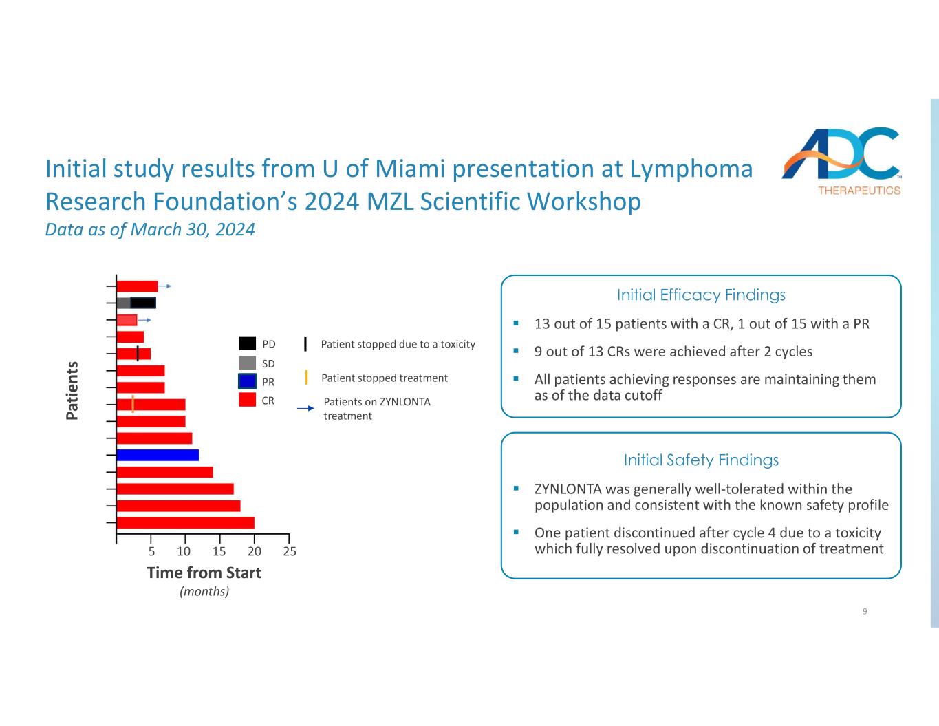 9 PR CR PD SD Patients on ZYNLONTA treatment Patient stopped treatment Patient stopped due to a toxicity 13 out of 15 patients with a CR, 1 out of 15 with a PR 9 out of 13 CRs were achieved after 2 cycles All patients achieving responses are maintaining them as of the data cutoff Initial Efficacy Findings ZYNLONTA was generally well-tolerated within the population and consistent with the known safety profile One patient discontinued after cycle 4 due to a toxicity which fully resolved upon discontinuation of treatment Initial Safety Findings Initial study results from U of Miami presentation at Lymphoma Research Foundation’s 2024 MZL Scientific Workshop Data as of March 30, 2024 Pa tie nt s Time from Start (months) 5 10 15 20 25