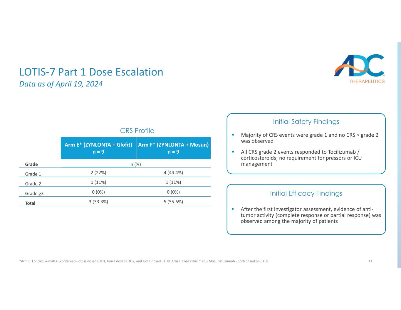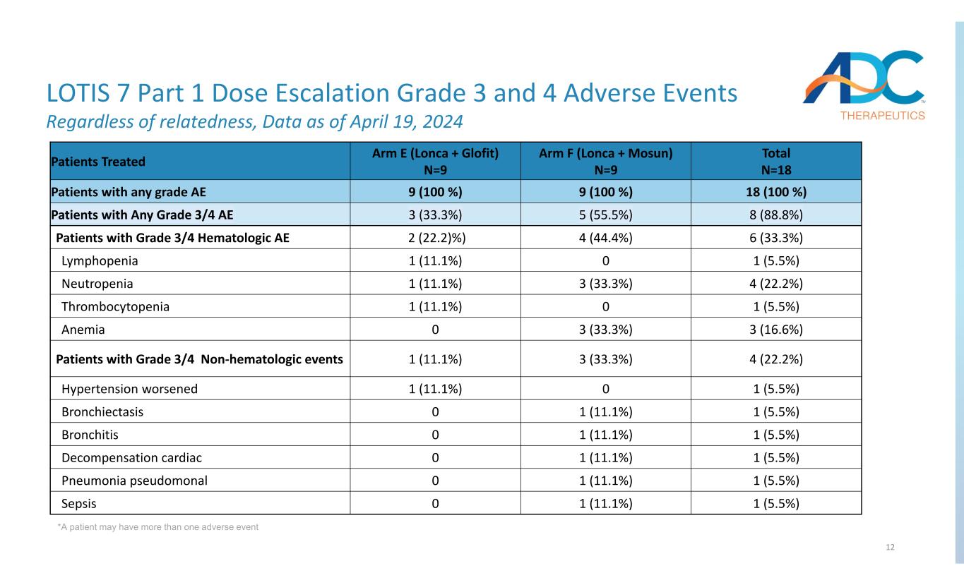 11 Arm F* (ZYNLONTA + Mosun) n = 9 Arm E* (ZYNLONTA + Glofit) n = 9 n (%)Grade 4 (44.4%)2 (22%)Grade 1 1 (11%)1 (11%)Grade 2 0 (0%)0 (0%)Grade >3 5 (55.6%)3 (33.3%)Total CRS Profile After the first investigator assessment, evidence of anti- tumor activity (complete response or partial response) was observed among the majority of patients Majority of CRS events were grade 1 and no CRS > grade 2 was observed All CRS grade 2 events responded to Tocilizumab / corticosteroids; no requirement for pressors or ICU management Initial Safety Findings Initial Efficacy Findings LOTIS-7 Part 1 Dose Escalation Data as of April 19, 2024 *Arm E: Loncastuximab + Glofitamab - obi is dosed C1D1, lonca dosed C1D2, and glofit dosed C1D8, Arm F: Loncastuximab + Mosunetuzumab - both dosed on C1D1.