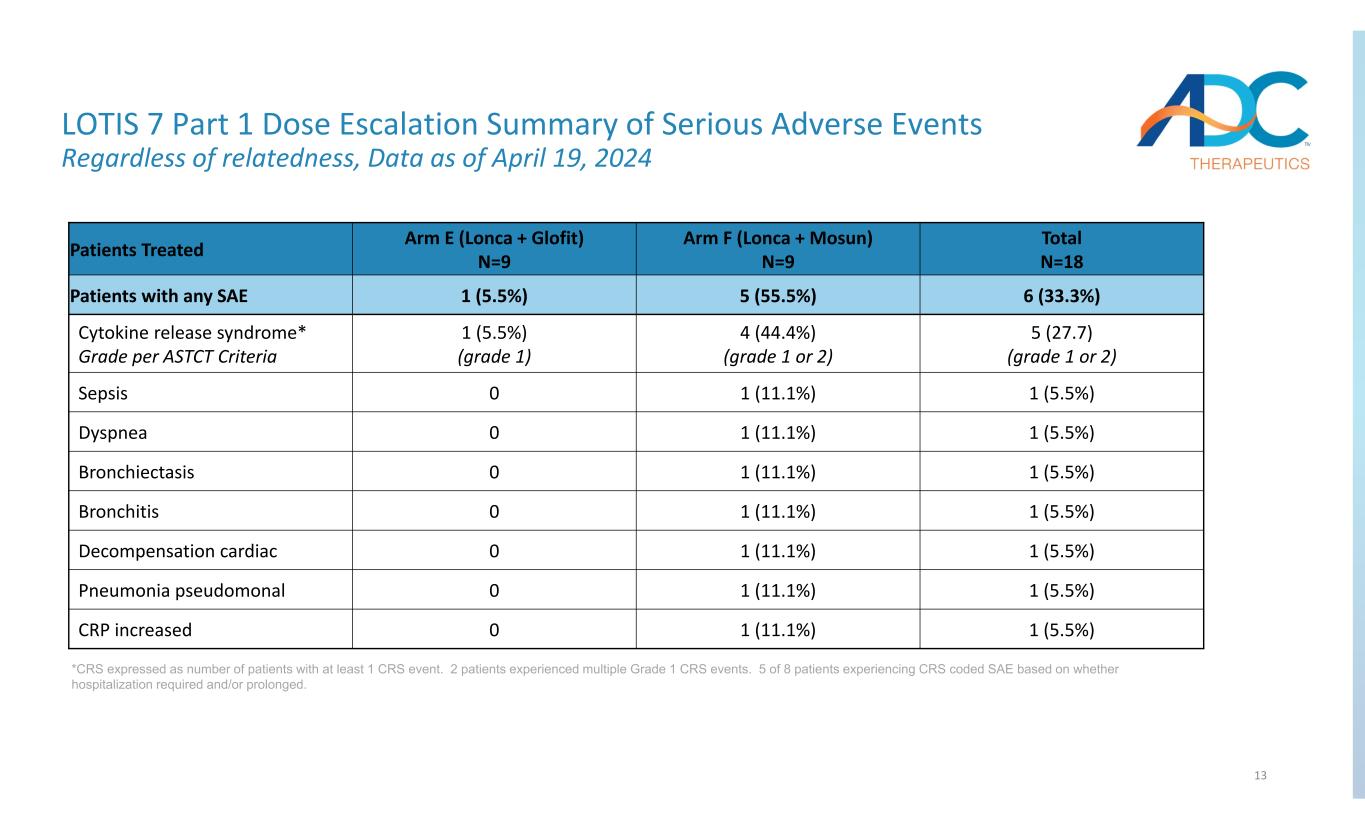 12 LOTIS 7 Part 1 Dose Escalation Grade 3 and 4 Adverse Events Regardless of relatedness, Data as of April 19, 2024 *A patient may have more than one adverse event Total N=18 Arm F (Lonca + Mosun) N=9 Arm E (Lonca + Glofit) N=9 Patients Treated 18 (100 %) 9 (100 %) 9 (100 %) Patients with any grade AE 8 (88.8%)5 (55.5%)3 (33.3%)Patients with Any Grade 3/4 AE 6 (33.3%)4 (44.4%) 2 (22.2)%)Patients with Grade 3/4 Hematologic AE 1 (5.5%)01 (11.1%)Lymphopenia 4 (22.2%)3 (33.3%)1 (11.1%)Neutropenia 1 (5.5%)01 (11.1%)Thrombocytopenia 3 (16.6%)3 (33.3%)0Anemia 4 (22.2%)3 (33.3%)1 (11.1%)Patients with Grade 3/4 Non‐hematologic events 1 (5.5%)01 (11.1%)Hypertension worsened 1 (5.5%)1 (11.1%)0Bronchiectasis 1 (5.5%)1 (11.1%)0Bronchitis 1 (5.5%)1 (11.1%)0Decompensation cardiac 1 (5.5%)1 (11.1%)0Pneumonia pseudomonal 1 (5.5%)1 (11.1%)0Sepsis